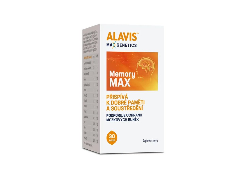 Alavis MAX Genetics Memory MAX je vysoce komplexní doplněk pro mozkovou činnost, koncentraci a vitalitu nervového systému. Je ideální pro studenty, osoby s vysokým psychickým zatížením i pro seniory.