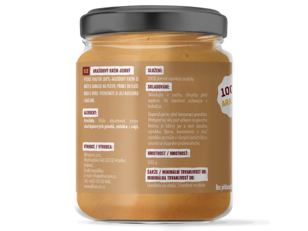 Jemně mletý, vysoce kvalitní 100% arašídový krém obsahuje bílkoviny, zdravé tuky, nenasycené mastné kyseliny, vitamíny, minerály a sacharidy. V arašídovém krému dále nalezneme vitaminy E, B1 a B3, koenzym Q10, kyselinu listovou, hořčík a fosfor. Arašídový krém si můžete namazat na pečivo, přidat do kaše nebo k ovoci. Vychutnáte si jej nasladko i naslano.