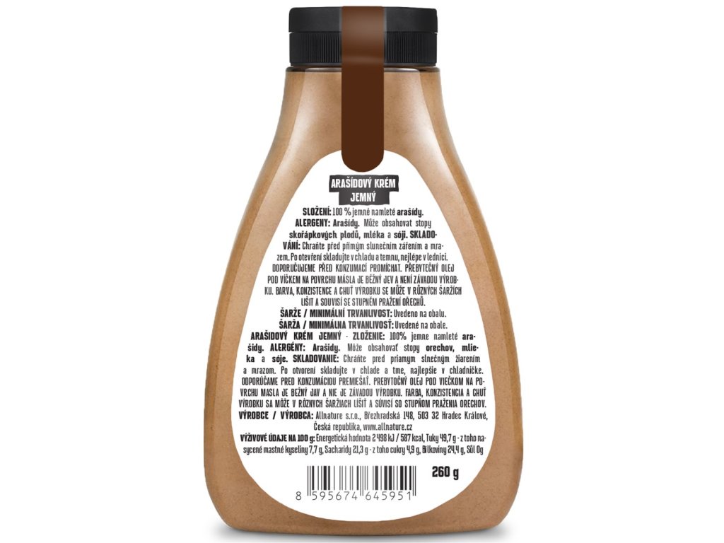Jemně mletý, vysoce kvalitní 100% arašídový krém obsahuje bílkoviny, zdravé tuky, nenasycené mastné kyseliny, vitamíny, minerály a sacharidy. V arašídovém krému dále nalezneme vitaminy E, B1 a B3, koenzym Q10, kyselinu listovou, hořčík a fosfor. Arašídový krém si můžete namazat na pečivo, přidat do kaše nebo k ovoci. Vychutnáte si jej nasladko i naslano.