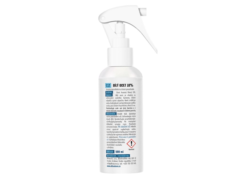 Bílý kvasný ocet s 10 % kyseliny octové je ve srovnání s klasickým 8% octem koncentrovanější a neobsahuje cukr, takže má průhlednou barvu a na čištěných površích nenechává žádné stopy. Je velmi účinným čisticím a dezinfekčním prostředkem s širokými možnostmi použití při úklidu domácnosti. Využijte jej k odstranění plísní a bakterií, zápachu z pračky či lednice, odstranění vodního kamene v koupelně a kuchyni, změkčení vody, hubení plevele apod.