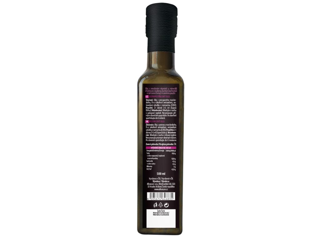 Za studena lisovaný ostropestřecový olej. Obsahuje vitamíny A, B, E a D, antioxidanty a karotenoidy. Má nahořklou chuť. Ideální k dochucování salátů, lze ale použít i jako masážní olej.