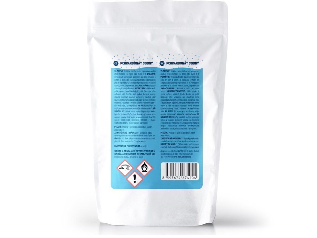 Perkarbonát sodný slouží především jako bělič při praní a čištění. Je ekologický a vhodný pro alergiky. Doporučujeme prát při teplotě 60 °C. Perkarbonát je výborný také na čištění odtoků, toalet, umyvadel atd.