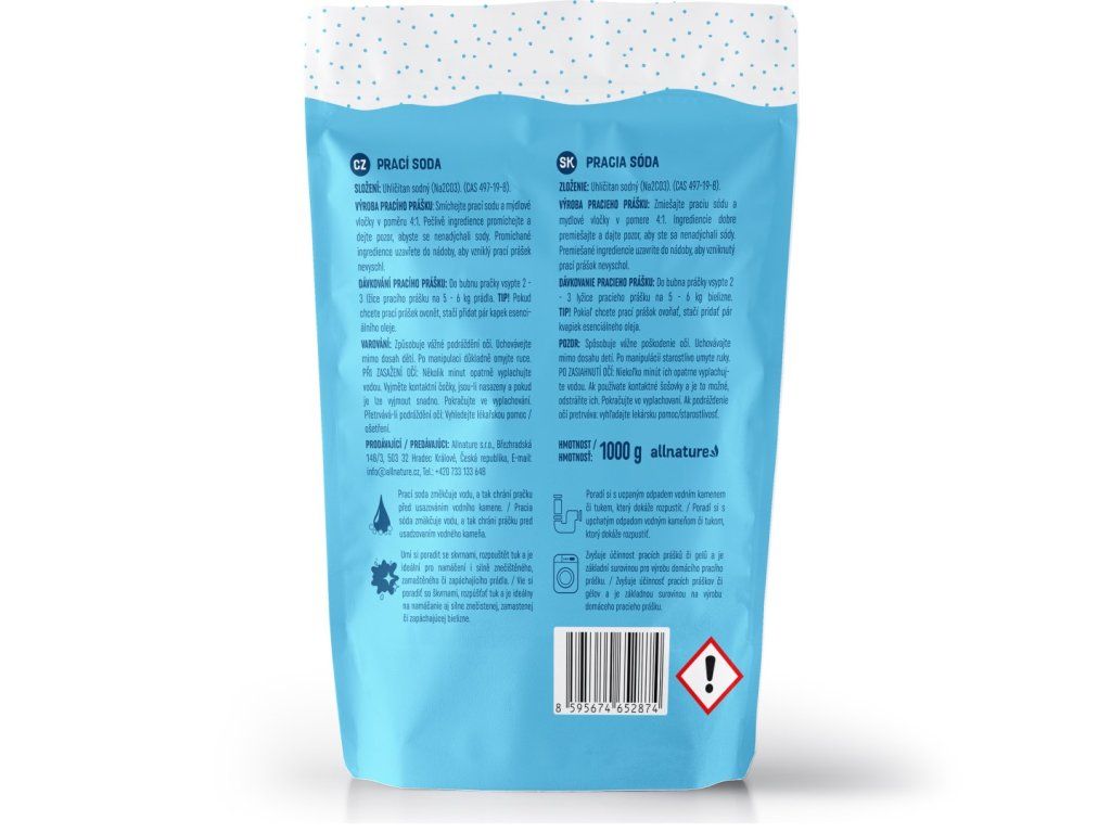 Allnature Prací soda je vhodná jako doplněk či náhrada pracího prostředku. Lze jí také odmašťovat mastné, připálené plechy formou odmáčení.