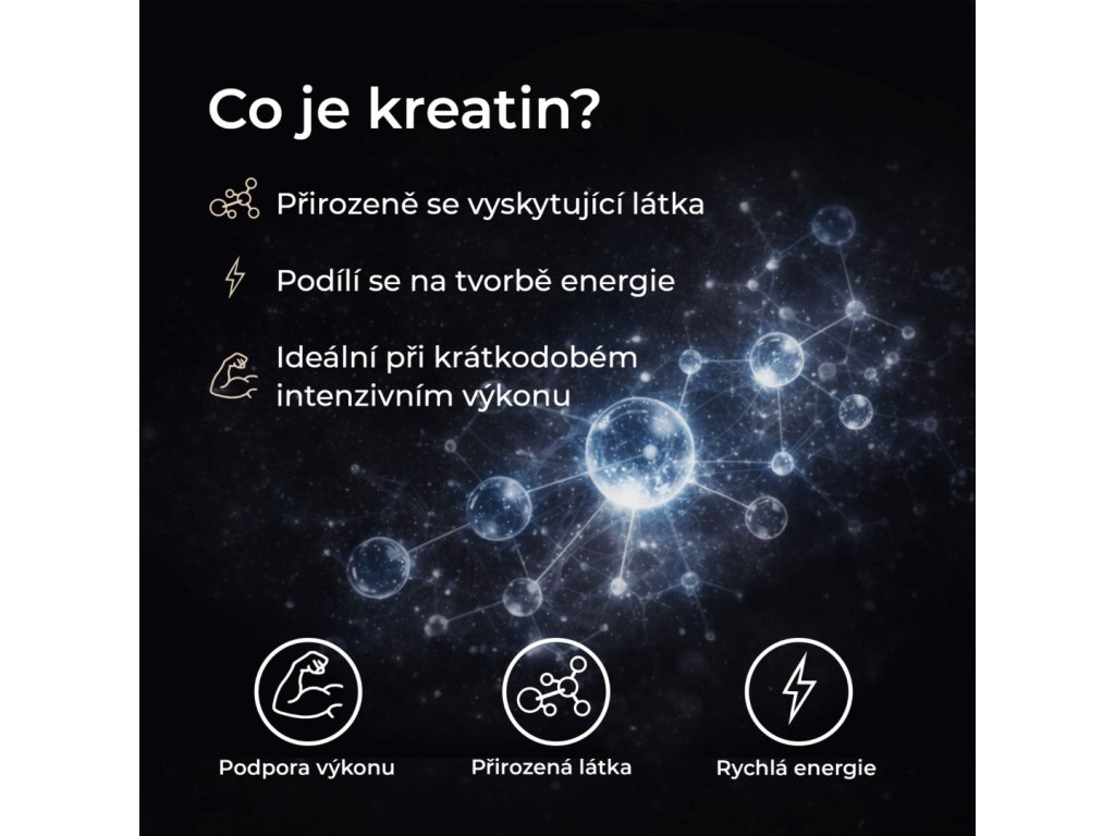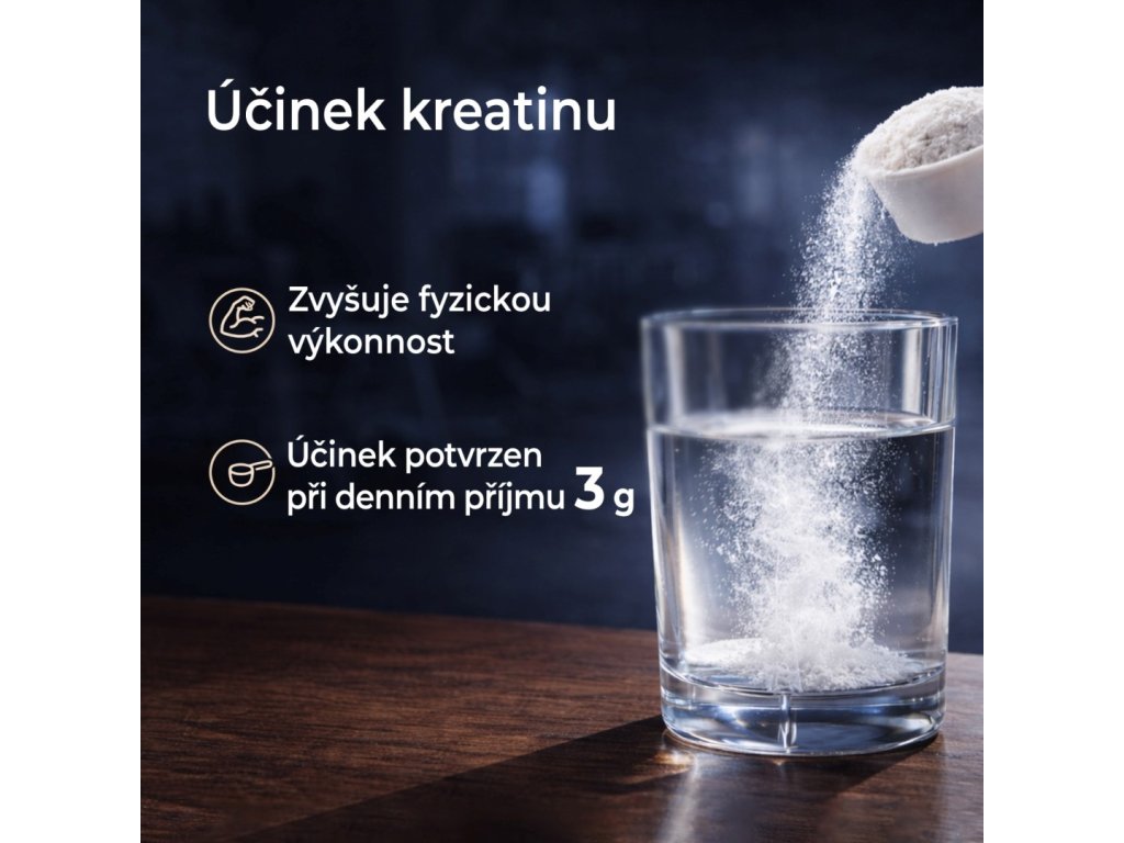 Kreatin přirozeně zvyšuje fyzickou výkonnost při krátkodobých, po sobě jdoucích intervalech vysoce intenzivního cvičení. Tento účinek se projevuje při denním příjmu alespoň 3 g kreatinu.