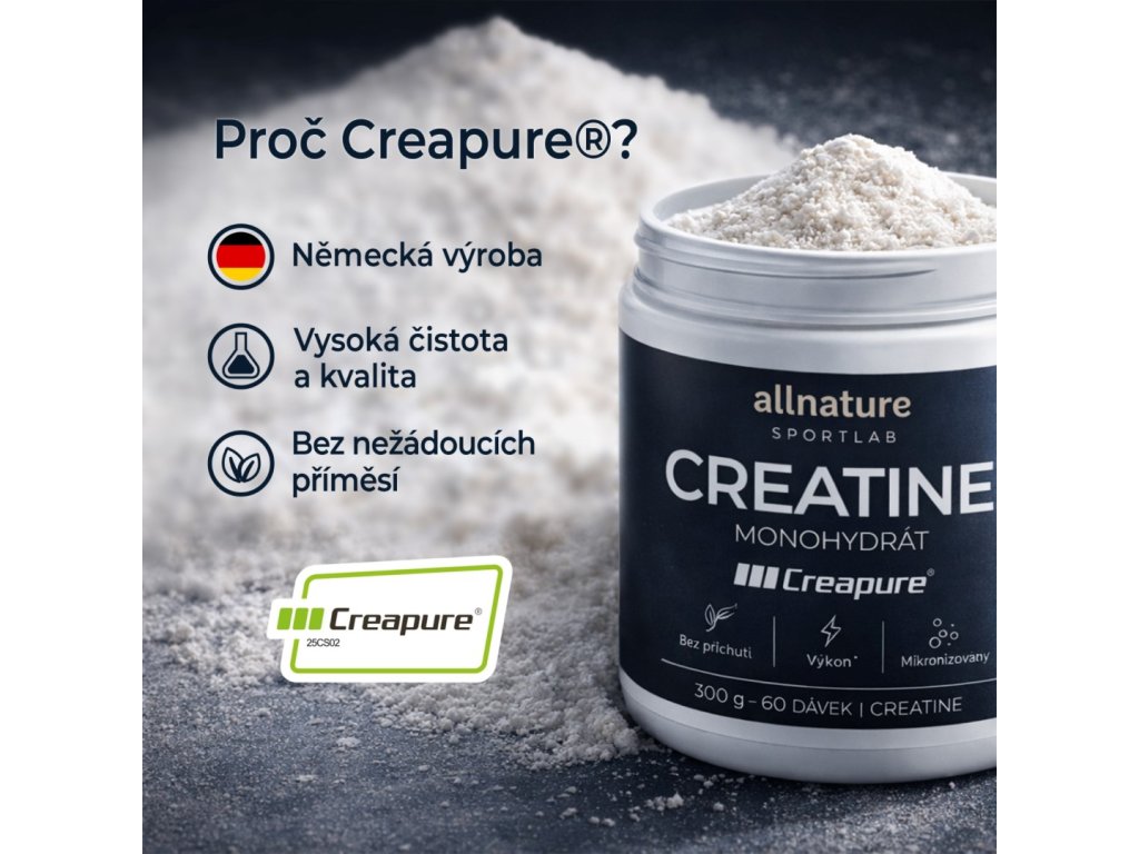 Allnature Kreatin monohydrát je vysoce čistý kreatin ve formě jemného prášku, určený pro podporu sportovního výkonu, síly a regenerace.