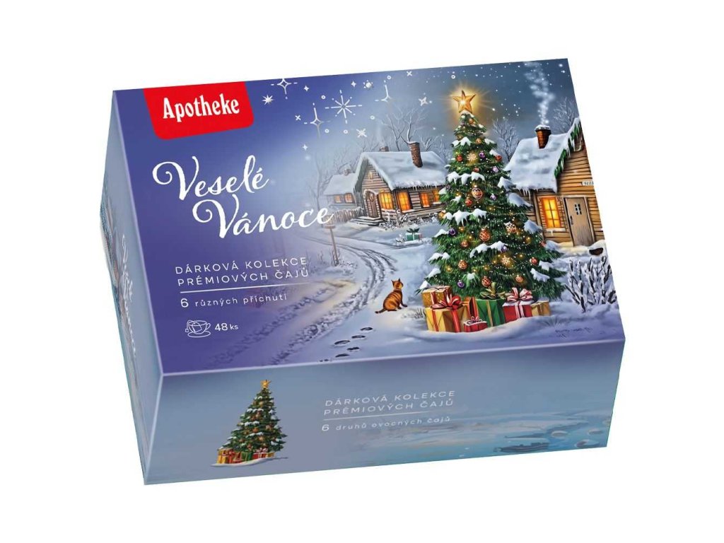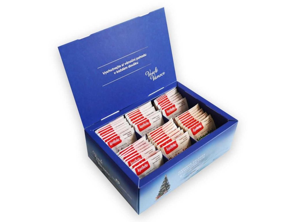 Dárková kazeta s vybranými prémiovými čaji Apotheke, sestavená speciálně pro zimní období. Vykouzlete si příjemnou sváteční atmosféru se Svátečním punčem, prožijte Vánoční kouzlo nebo se prostě jen příjemně zahřejte šálkem lahodného ovocného čaje. Dárková kolekce vybraných prémiových ovocno-bylinných čajů obsahuje 6 druhů čajů po 8 kusech, celkem 48 nálevových sáčků.