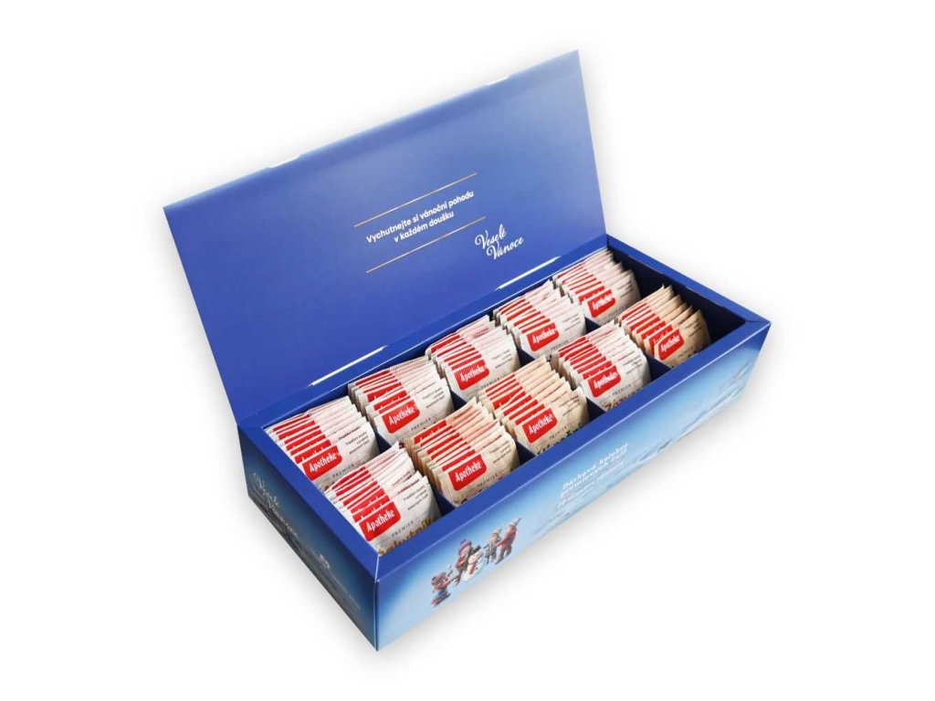 Dárková kazeta s vybranými prémiovými čaji Apotheke, sestavená speciálně pro zimní období. Vykouzlete si příjemnou sváteční atmosféru se Svátečním punčem, prožijte Vánoční kouzlo nebo se prostě jen příjemně zahřejte šálkem lahodného ovocného čaje. Dárková kolekce vybraných prémiových ovocno-bylinných čajů obsahuje 10 druhů čajů po 9 kusech, celkem 90 nálevových sáčků.