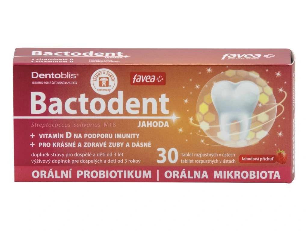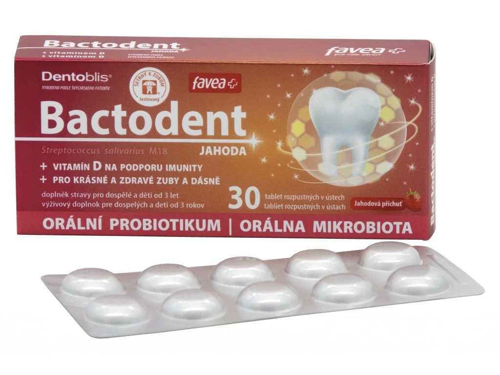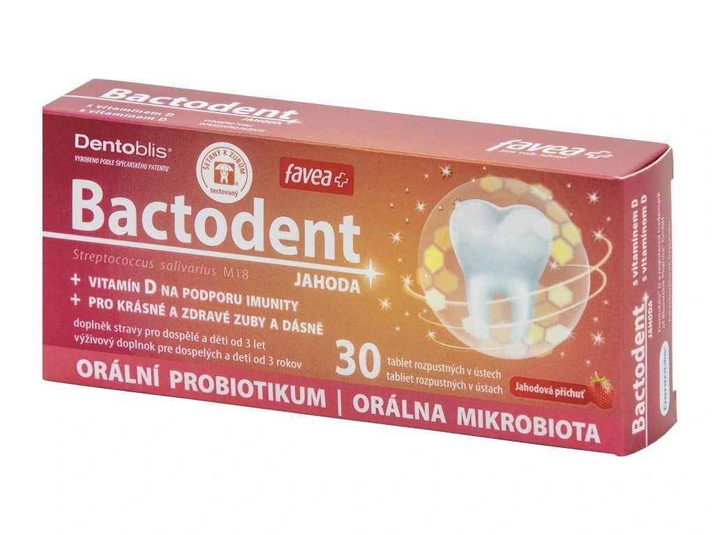 Pečujte o svou ústní dutinu! Favea Bactodent Máta je doplněk stravy kombinující probiotickou kulturu Streptococcus salivarius M18 a vitamín D. Streptococcus salivarius je přirozenou součástí ústní mikroflóry a vitamín D přispívá k udržení normálního stavu zubů a k normální funkci imunitního systému. Favea Bactodent má navíc příjemnou jahodovou příchuť.