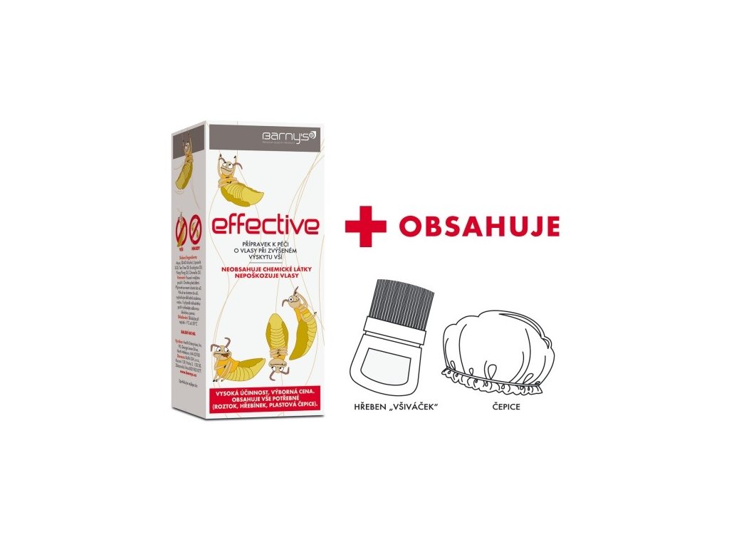 Dle našeho názoru jeden z nejvíce efektivních, nejvíce šetrných a nejekonomičtějších přípravků na trhu na dětské vši. Barny´s Effective to je efektivní, rychlá a šetrná pomoc když dítě ze školy či z dětského tábora potřebuje obnovit vlasovou hygienu. Balení obsahuje i hřebínek všiváček a čepici.