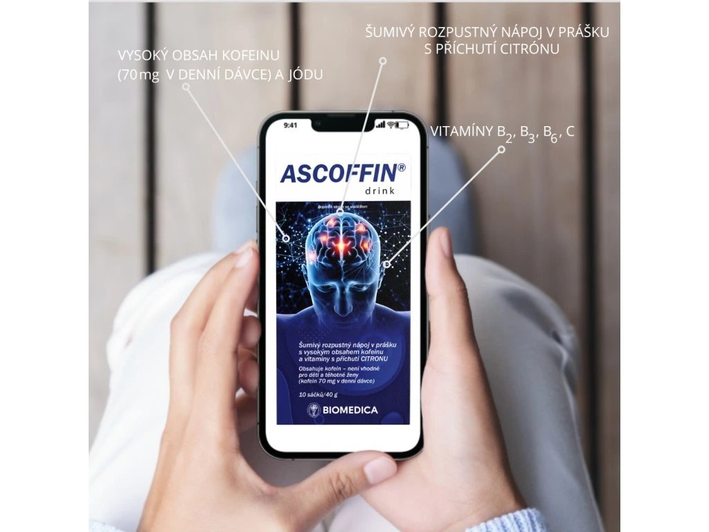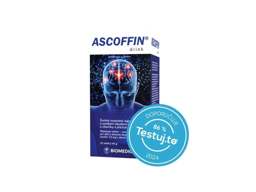 Ascoffin® je doplněk stravy ve formě rozpustného šumivého nápoje, který poskytuje rychlou dávku energie a podporu mentální výkonnosti. Díky obsahu kofeinu (70 mg v denní dávce) pomáhá zvýšit bdělost, koncentraci a zlepšit soustředění během pracovního dne, studia nebo při zvýšené fyzické a psychické zátěži.