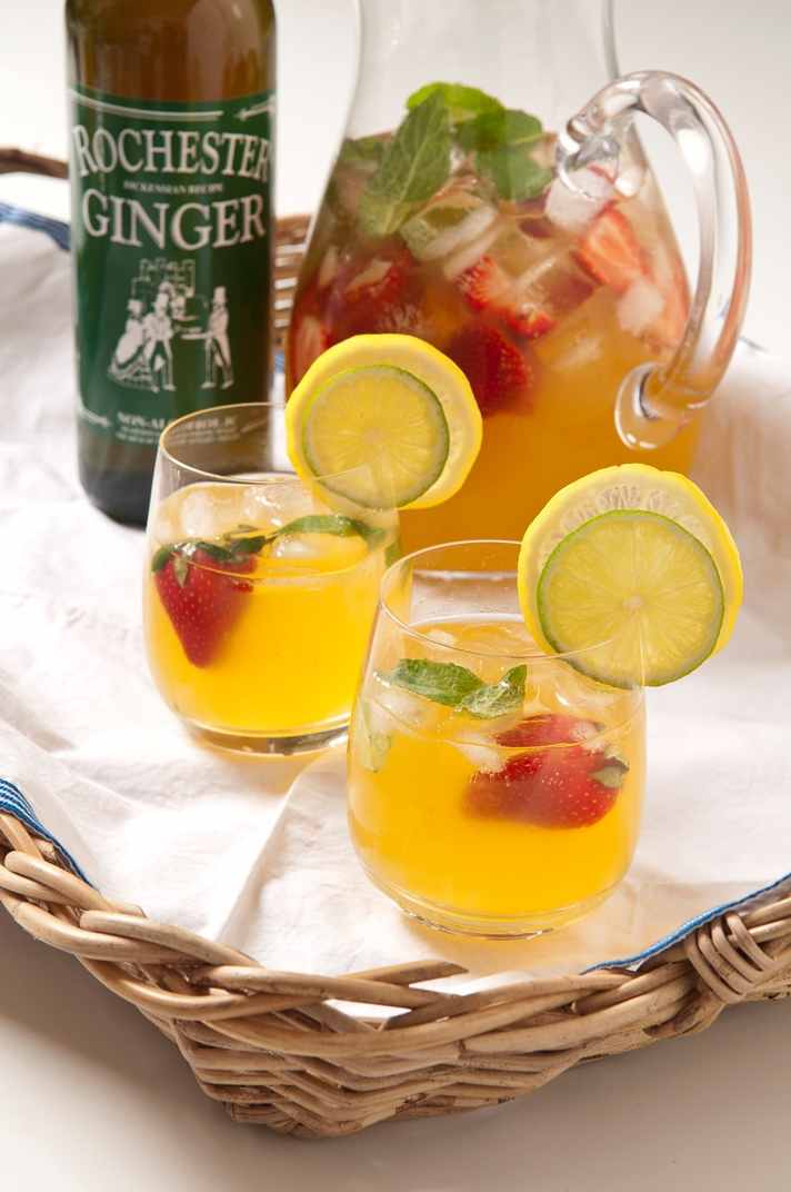 Použijte 2 litrovou nádobu a dejte do ní všechny ingredience (Rochester Ginger, džusy, vodu) a promíchejte s ledem. Poté dozdobte jahodami, mátou a plátky pomeranče, citronu nebo limetky. Jablečný a mango džus můžete nahradit čímkoliv dle vašich preferencí.