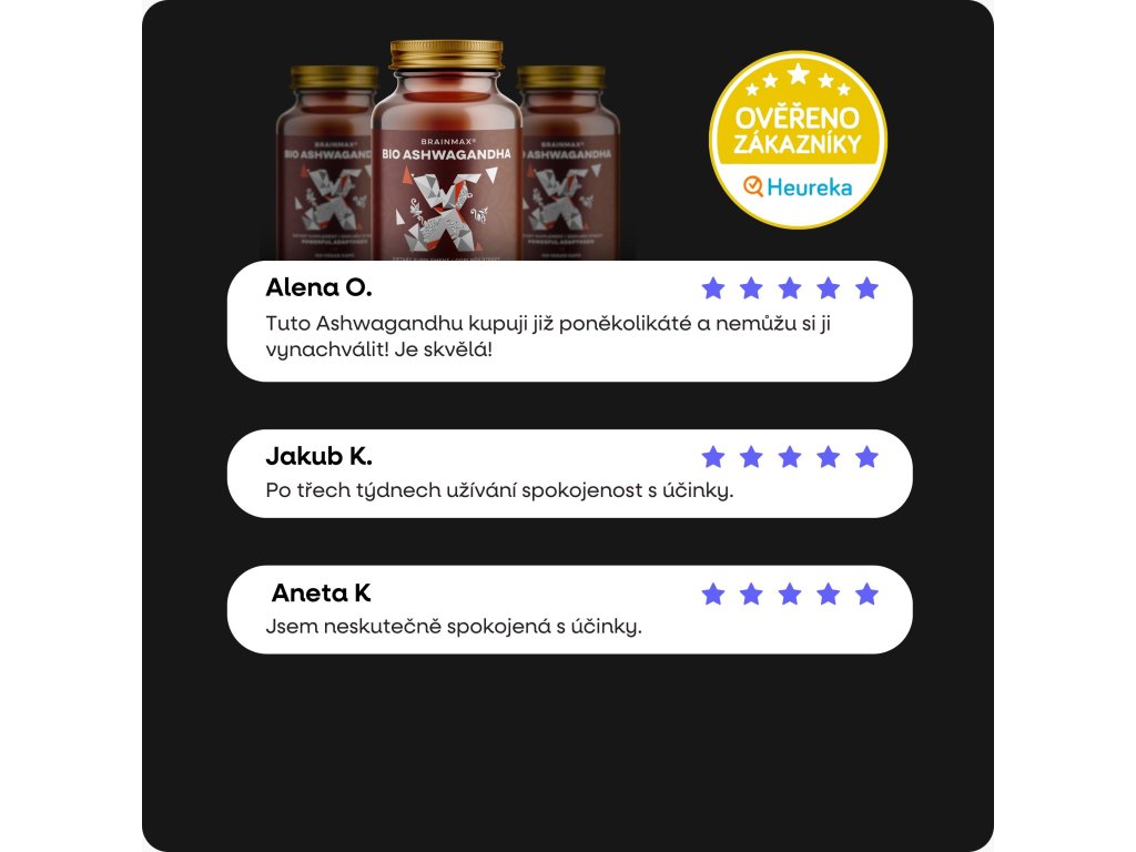 Ashwagandha jako adaptogen Ashwagandha je jedním z nejvýznamnějších adaptogenů na světě, tradičně používána v ajurvédě, byla předmětem více než 300 klinických studií a její užívání doporučuje např. neurovědec Andrew Huberman. Její široké spektrum účinků z ní činí komplexní přírodní doplněk. Duševní zdraví a relaxace Léčivo v ajurvédě již před více než 3000 lety 100% čistá a nezpracovaná BIO Ashwagandha Zdravotní tvrzení vztahující se k Ashwagandě1 Duševní a kognitivní činnost – koncentrace, únava Duševní zdraví a relaxace Normální činnost kardiovaskulárního systému Chuť k jídlu Duševní zdraví, stres & spánek Omlazení Normální funkce reprodukčního systému Normální funkce dýchacího systému Normální stav pokožky Antioxidant Ashwagandha – podpora duševního zdraví a odolnosti vůči stresu Ashwagandha jako adaptogen přispívá k duševnímu zdraví, podporuje odolnost vůči stresu, napomáhá relaxaci a spánku a podporuje kognitivní funkce a koncentraci. Testováno na kvalitu. Certifikováno pro bezpečnost. BrainMax BIO Ashwagandha je testována v nezávislé akreditované laboratoři, která provádí důkladnou analýzu s cílem ověřit její nezávadnost, čistotu a soulad s legislativními limity pro doplňky stravy. Co hlídáme? Těžké kovyMikrobiologickou nezávadnostCertifikát zdravotní bezpečnosti Těžko kovy Hodnota Kadmium NQ Olovo 0,51 Rtuť NQ Mikroorganismy Hodnota Celkový počet mikrobů 3,5x102 Plísně 1,5x102 Kvasinky <50 E.coli Neg. Salmonella spp. Neg. Pro koho je super ashwagandha vhodná? Sportovci a fyzicky aktivní lidé - při intenzivním cvičení, běhu, bojových sportech nebo jiných sportovních aktivitách. Lidé s náročným pracovním režimem - při dlouhých pracovních dnech nebo ve dnech se zvýšenou mentální či fyzickou pracovní zátěží. Pro všechny, kteří se potřebují vrátit do rovnováhy – ať už po náročném dni nebo během celého životního maratonu. Ashwagandha není zázrak přes noc, ale spolehlivý parťák pro dlouhodobou odolnost vůči stresu. Když svět kolem šílí, vy zůstáváte nohama na zemi - díky jejím účinkům na duševní zdraví a podporu relaxace. Pro všechny, kteří chtějí snížit dopad stresu. Působí totiž jako antioxidant S jakými dalšími produkty Ashwagandhu používat Hořčík - přispívá k normální činnosti nervového systému a skvěle doplní učinky ashwagandhy Shilajit - Oba jsou velmi ceněné v ajurvédě a zároveň působí jako antioxidant a mají vliv na omlazení L-theanin - Synergický účinek během náročných dní Anabolic dagger - Kombinace složek vybraných pro podporu těla při fyzické zátěži a náročném tréninku. Zdroje: 1. Majeed, M., Nagabhushanam, K., & Mundkur, L. (2023). A standardized Ashwagandha root extract alleviates stress, anxiety, and improves quality of life in healthy adults by modulating stress hormones: Results from a randomized, double-blind, placebo-controlled study. Medicine, 102. 2. Chandrasekhar, K., Kapoor, J., & Anishetty, S. (2012). A Prospective, Randomized Double-Blind, Placebo-Controlled Study of Safety and Efficacy of a High-Concentration Full-Spectrum Extract of Ashwagandha Root in Reducing Stress and Anxiety in Adults. Indian Journal of Psychological Medicine, 34, 255 - 262. 3. Salve, J., Pate, S., Debnath, K., & Langade, D. (2019). Adaptogenic and Anxiolytic Effects of Ashwagandha Root Extract in Healthy Adults: A Double-blind, Randomized, Placebo-controlled Clinical Study. Cureus, 11. 4. Gopukumar, K., Thanawala, S., Somepalli, V., Rao, T., Thamatam, V., & Chauhan, S. (2021). Efficacy and Safety of Ashwagandha Root Extract on Cognitive Functions in Healthy, Stressed Adults: A Randomized, Double-Blind, Placebo-Controlled Study. Evidence-based Complementary and Alternative Medicine : eCAM, 2021 5. Langade, D., Kanchi, S., Salve, J., Debnath, K., & Ambegaokar, D. (2019). Efficacy and Safety of Ashwagandha (Withania somnifera) Root Extract in Insomnia and Anxiety: A Double-blind, Randomized, Placebo-controlled Study. Cureus, 11. 6. Kelgane, S., Salve, J., Sampara, P., & Debnath, K. (2020). Efficacy and Tolerability of Ashwagandha Root Extract in the Elderly for Improvement of General Well-being and Sleep: A Prospective, Randomized, Double-blind, Placebo-controlled Study. Cureus, 12. Dávkování 1 kapsle 1-3 krát po jídle. Doporučujeme užívat 6 týdnů a poté udělat 10 denní pauzu. Následně můžete opět pokračovat v užívání. Nedoporučujeme užívat při onemocnění štítné žlázy bez porady s lékařem. Složení: BIO certifikace CZ-BIO-001 Produkce ekologického zemědělství EU/mimo EU. Složení: 100% BIO kořen Ashwagandhy (Withania somnifera) Legenda: Zdravotní tvrzení uvedena na on hold seznamu podle nařízení (ES) č. 1924/2006, o výživových a zdravotních tvrzeních při označování potravin a mohou být používána v souladu s čl. 28 odst. 5 a 6 tohoto nařízení pro: Ashwagandha1 Distributor: BRAINMARKET s.r.o., Hladnovská 83/93, Ostrava Upozornění: Ukládat mimo dosah dětí. Výrobek není určen pro těhotné a kojící ženy. Neslouží jako náhrada pestré stravy. Dodržujte zdravý životní styl. U citlivých jedinců může ashwagandha vyvolat žaludeční nevolnost nebo alergickou reakci. Hmotnost: 100 rostlinných kapslí. Velikost dávky: 1 rostlinná kapsle Množství v 1 dávce %RHP* BIO Ashwagandha 560 mg *** * % denní referenční hodnoty příjmu*** denní referenční hodnota příjmu není stanovena
