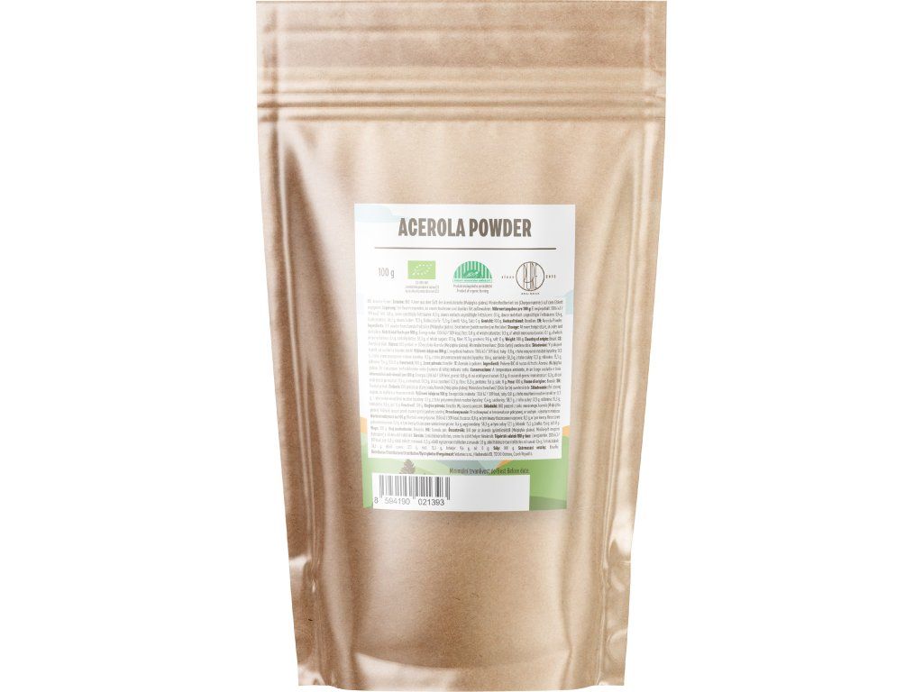 Jeden z nejbohatších přírodních zdrojů vitamínu C Acerola je tropická třešeň s mimořádně vysokým obsahem vitamínu C – až 14× více než běžný pomeranč (v přepočtu na hmotnost). Tento 100% čistý BIO prášek se získává ze šťávy lisovaných plodů pěstovaných v ekologickém zemědělství. Jedna čajová lžička dodá tělu významné množství vitamínu C, který přispívá k normální funkci imunitního systému, snižuje únavu a chrání buňky před oxidativním stresem. Prášek má přirozeně nakyslou chuť a skvěle se hodí do smoothie, kaší nebo nápojů. Proč je pro tělo vitamín C nezbytný? Vitamín C přispívá k normální funkci imunitního systému a chrání buňky před oxidativním stresem. Podílí se na tvorbě kolagenu, který je důležitý pro normální funkci kostí, chrupavek, zubů, cév i pokožky. Zvyšuje vstřebávání železa z potravy a podporuje normální činnost nervové soustavy. Acerola a její výhody Jedná se o prášek ze šťávy lisovaných třešní aceroly pěstovaných v ekologické zemědělské produkci. Je vhodný pro přidávání do smoothie, jogurtu, nápojů nebo snídaňových kaší. 100% RAW surovina z Brazílie v BIO kvalitě. Patří mezi ovoce s nejvyšším přirozeným obsahem vitamínu C. Velmi silný antioxidační účinek (vitamin C). Obsahuje široké spektrum vitamínů a minerálů. Prášek ze šťávy lisovaných třešní aceroly. Bez sladidel, aromat a dalších aditiv. Dávkování Užívejte ½ až 1 čajové lžičky 1x až 2x denně ve vodě nebo džusu. Můžete přidávat do smoothie nebo snídaňové kaše. BrainPedia.cz - místo nabité informacemi! Se správnými informacemi nelze udělat špatné rozhodnutí. Výživové hodnoty na 100 g Energetická hodnota 1306 kJ / 309 kcal Tuky 0,8 g - z toho nasycené mastné kyseliny 0,3 g Sacharidy 58,3 g - z toho cukry 17,3 g Vláknina 15,3 g Bílkoviny 9,6 g Sůl 0 g BIO certifikace CZ-BIO-001 Naše acerola má BIO certifikát - Produkce ekologického zemědělství mimo EU. Nákupem podpoříte i české lesy #stromzaobjednavku! Složení: 100% BIO Acerola (Malpighia glabra) Původ: Brazílie Distributor: BRAINMARKET s.r.o., Vítkovice 3053, 703 00 Ostrava, Česká republika. Skladování: V suchu, v uzavřeném obalu. Hmotnost: 100 gDoplňkové parametry