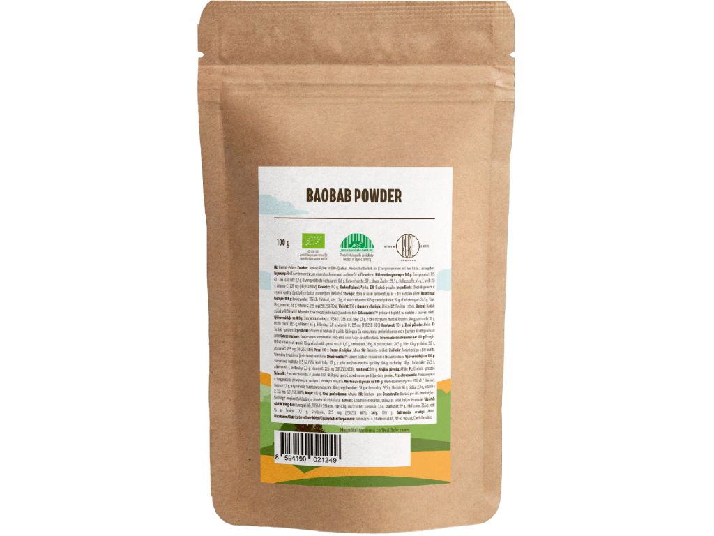 Vitaminová bomba z afrického stromu života! Baobab BIO prášek – přirozený zdroj vitamínu C a vlákniny. Plody mají přirozeně vysoký obsah důležitých živin. Prášek se vyrábí z jemně sušené dužiny a vyniká příjemně sladkokyselou chutí. Náš baobab prášek v RAW a BIO kvalitě obsahuje přirozeně se vyskytující vitamin C, vlákninu, vápník, draslík, železo a další stopové minerály. Zdroj vitamínu C Zdroj prebiotické vlákniny Zpracováno tradiční metodou Jak Baobab užívat? Tento sladkokyselý ovocný prášek je ideální pro přidání do jogurtu, smoothies, nápojových směsí. Díky obsahu vlákniny včetně pektinu jej lze použít k zahuštění džemů, želé, horkých cereálií a polévek. 1-2 vrchovaté lžičky denně (5-10 g) prášku z baobabu smíchejte se 150–200 ml vody nebo přidejte do proteinového šejku či nápoje, smoothie nebo jogurtu. Tip na použití Přidejte 1 lžičku baobabového prášku do ranního smoothie – skvěle se hodí k banánu, mangu nebo pomeranči a dodá příjemnou citrusovou chuť. Získáte tak přirozený zdroj vitamínu C a vlákniny. Výživové údaje na 100g Energetická hodnota 1115 kJ / 266 kcal Tuky 1,2 g - z toho nasycené mastné kyseliny 0,6 g Sacharidy 39 g - z toho cukry 26,5 g Vláknina 45 g Bílkoviny 2,8g Vitamin C 225 mg(281,25% DDD) BIO certifikace CZ-BIO-001 Náš Baobab má BIO certifikát - Produkce ekologického zemědělství mimo EU. Nákupem podpoříte i české lesy #stromzaobjednavku! Složení: 100% Baobab (Adansonia digitata) Původ: Afrika Distributor: BRAINMARKET s.r.o., Vítkovice 3053, 703 00 Ostrava, Česká republika. Skladování: V suchu, v uzavřeném obalu. Hmotnost: 100 gDoplňkové parametry