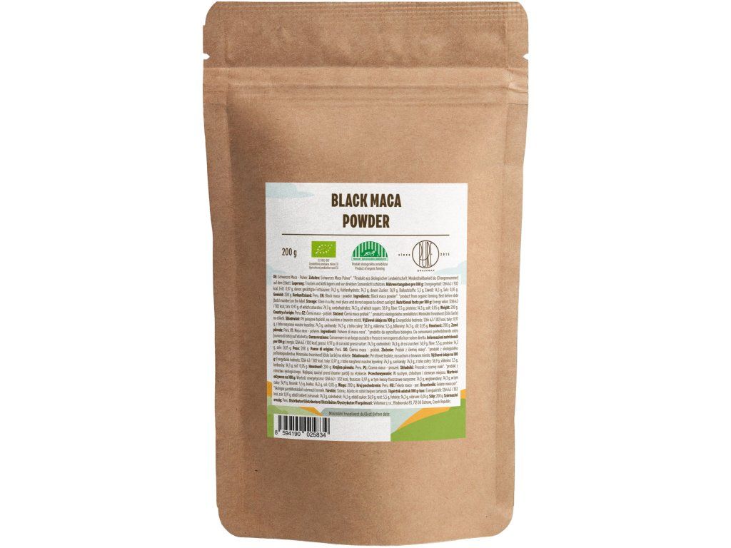 Jak macu užívat? V prvním týdnu užívejte jednu čajovou lžičku. V dalších dvou až třech týdnech zvyšte na 2 - 3 čajové lžičky denně. Po čtvrtém týdnu můžete užívat polévkovou lžici. Můžete ji přidávat do proteinového šejku, smoothie, kakaového nápoje nebo do snídaňové kaše. BrainPedia.cz - místo nabité informacemi! Se správnými informacemi nelze udělat špatné rozhodnutí. Výživové hodnoty na 100 g Energetická hodnota 1264 kJ / 302 kcal Tuky 0,97 g Sacharidy 74,3 g - z toho cukry 36,9 g Vláknina 5,5 g Bílkoviny 14,3 g Sůl 0,05 g BIO certifikace CZ-BIO-001 Naše Maca má BIO certifikát - Produkce ekologického zemědělství mimo EU. Nákupem podpoříte i české lesy #stromzaobjednavku! Složení: 100% BIO Maca černá (Lepidium meyenii) Původ: Peru Distributor: BRAINMARKET s.r.o., Vítkovice 3053, 703 00 Ostrava, Česká republika. Skladování: V suchu, v uzavřeném obalu. Hmotnost: 200 gDoplňkové parametry