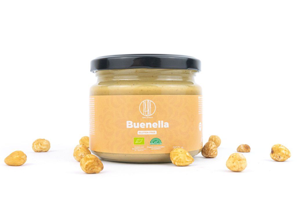 Návyková chuť! Jednou zkusíš, pak už musíš! Představujeme vám chuť jemného krému z BIO lískových oříšků smíchaného s BIO bílou čokoládou, který zamotá s vašimi chuťovými pohárky tak, že možná sníte celou sklenici na posezení. Přesně taková je nová Buenella! Na dochucení lívanců nebo jen tak Vynikací chuť i jemná konzistence dělá z Buenelly pochoutku do všech sladkých jídel jako jsou lívance či palačinky, ale také i do vašich zdravých snídaní s granolou či vločkami. Buenella je lahodná kombinace organických lískových oříšků a BIO bílé čokolády. To z ní dělá nebezpečně jednoduchou pochoutku. Přirozená proměnlivost konzistence Změny konzistence jsou přirozenou vlastností našeho krému, protože obsahuje vysoký podíl organických lískových oříšků (78 %) a kakaového másla z bílé čokolády. Neobsahuje žádná zahušťovadla ani stabilizátory, které by konzistenci uměle měnily. Necháváme vyniknout čistou chuť a kvalitu surovin. Můžete si ale konzistenci přizpůsobit vlastním preferencím: kolem 20 °C krém začíná přirozeně tuhnout a při uchování v chladu pod 18 °C je pevnější a hutnější. Naopak při 24–25 °C a více je jemně tekutý a krásně se roztírá. BrainPedia.cz - místo nabité informacemi! Se správnými informacemi nelze udělat špatné rozhodnutí. Recepty s tímto produktem Lískooříškové cupcakes s mascarpone Výživové hodnoty na 100 g Energetická hodnota 2715 kJ / 649 kcal Tuky 57,32 g - z toho nasycené mastné kyseliny 8,51 g Sacharidy 14,74 g - z toho cukry 14,35 g Vláknina 7,04 g Bílkoviny 14,91 g Sůl 0,07 g Výživové hodnoty na dávku 30 g Energetická hodnota 815 kJ / 195 kcal Tuky 17,20 g - z toho nasycené mastné kyseliny 2,55 g Sacharidy 4,42 g - z toho cukry 4,31 g Vláknina 2,11 g Bílkoviny 4,47 g Sůl 0,02 g BIO certifikace CZ-BIO-001 Náš krém má BIO certifikát - Produkce ekologického zemědělství EU / mimo EU. Nákupem podpoříte i české lesy #stromzaobjednavku! Složení: (78 %) lískooříškový krém*, (20 %) bílá čokoláda* (třtinový cukr*, kakaové máslo*, sušené mléko*, emulgátor: sojový lecitin*, vanilkový extrakt*, vanilka*), sušené mléko*. *produkt z ekologického zemědělství. Obsahuje 100 % surovin zemědělského původu v BIO kvalitě. Minimální trvanlivost (číslo šarže) na boční straně. Uchovávejte v suchu, chladu a nevystavujte přímému slunečnímu záření. Olej na povrchu je přirozeným jevem, před konzumací promíchejte. Původ: Vyrobeno v ČR. Distributor: BRAINMARKET s.r.o., Vítkovice 3053, 703 00 Ostrava, Česká republika. Skladování: Uchovávejte v suchu a nevystavujte přímému slunečnímu záření. Hmotnost: 250 gDoplňkové parametry