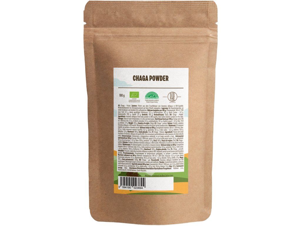Dávkování 1 - 3 g denně s minimálním půlhodinovým odstupem od jídla, rozmíchat v cca 1 dcl vody a vypít (1 zarovnaná kávová lžička = 2 g prášku). Doporučujeme užívat vždy 5 dní v týdnu a 2 dny vynechat. Užívejte na lačno (min. 30 minut před jídlem či 60 minut po jídle). Můžete ji přimíchat do jakéhokoli oblíbeného nápoje nebo jídla. Prášek je vhodný k přimíchání do džusu, čaje, kakaaa nebo kávy. Chaga se tak může stát součástí každodenní rutiny. Současná legislativa nám neumožňuje zmiňovat veškeré možné zdravotní přínosy. Balení: 100 g na 100g Energetická hodnota 814 kJ / 200 kcal Tuky 0,3 g - z toho nasycené mastné kyseliny 0,2 g Sacharidy 10,1 g - z toho cukry < 0.2 g Vláknina 70.8 g Bílkoviny 3,9 g Sůl < 0.1 g BIO certifikace CZ-BIO-001 Naše Chaga má BIO certifikát - Produkce ekologického zemědělství EU / mimo EU. Nákupem podpoříte i české lesy #stromzaobjednavku! Složení: BIO Prášek plodnice Chaga - Inonotus obliquus (biomasa/powder). Neobsahuje kofein, lepek, konzervační látky, barviva ani cukr. Původ: Čína Upozornění: Produkt není určen pro děti do 3 let, pro těhotné a kojící. Nepřekračujte doporučené denní dávkování. Uchovávejte mimo dosah dětí. Produkt neslouží jako náhrada pestré stravy. Distributor: BRAINMARKET s.r.o., Vítkovice 3053, 703 00 Ostrava, Česká republika. Skladování: Skladujte na suchém a temném místě. Obsah: 100gDoplňkové parametry