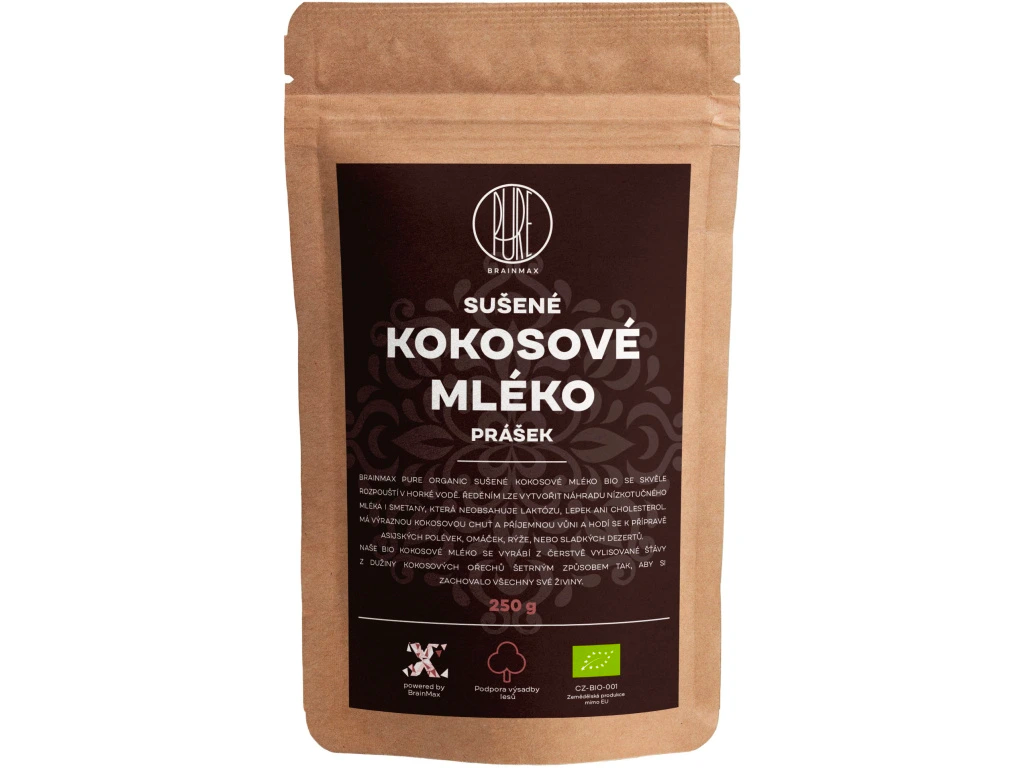 Kokosový rostlinný nápoj do vaření i pečení Kokosový nápoj patří mezi oblíbené ingredience v asijské kuchyni, zejména v indických a thajských receptech. Má jemně nasládlou chuť a typické kokosové aroma. Neobsahuje laktózu, a proto je vhodnou alternativou pro ty, kteří se mléčným výrobkům vyhýbají. Kokosový prášek se skvěle hodí do sladkých i slaných pokrmů, dezertů, smoothie nebo kávových nápojů. Zdravé tuky Vysoký obsah minerálů Čisté složení Jak vytěžit kokos v prášku na maximum Instantní kokosové mléko za pár vteřin – stačí rozmíchat s teplou nebo studenou vodou, ideální na cesty i do práce. Do kávy místo mléka – krémovější, chutnější a bez laktózy. Navíc s MCT tuky, které nakopnou mozek i metabolismus. Do smoothie, kaše nebo jogurtu – kokosový prášek dodá exotickou chuť a zdravé tuky navíc. Na vaření a pečení – pro kokosovou chuť v dezertech, sušenkách, palačinkách i kari. Do proteinového šejku nebo pre-workoutu – pro lepší konzistenci a výživový upgrade. Jako nouzová zásoba – nemusíte řešit chlazení ani rychlou spotřebu jako u plechovky. Doporučujeme na cesty - oceníte praktičnost i lehkost, kterou snadno zabalíte na cesty. Čisté kokosové složení bez zbytečných přísad Kokosový nápoj BrainMax Pure je vyroben ze sušené kokosové dužiny a neobsahuje žádné přidané látky, umělá aromata, konzervanty ani přidaný cukr. Jeho přirozená chuť a vůně pochází výhradně z ekologicky pěstovaných kokosů. Kokosová dužina je přirozeným zdrojem vlákniny a obsahuje také vitaminy a minerální látky, jako je vitamin B1, hořčík, mangan či fosfor – v přirozeně se vyskytujících množstvích. Tip na použití Kokosové mléko v prášku je skvělé do smoothies, kaší nebo jako základ pro exotické omáčky a kari. Stačí ho rozmíchat ve vodě a máte rostlinnou alternativu mléka vždy po ruce. Výživové údaje na 100 g Energetická hodnota 2640 kJ / 640 kcal Tuky 50 g - z toho nasycené mastné kyseliny 48 g Sacharidy 40,25 g - z toho cukry 1,25 g Bílkoviny 6,26 g Sůl 0,3 g BIO certifikace CZ-BIO-001 Naše kokosové mléko má BIO certifikát - Produkce ekologického zemědělství mimo EU. Nákupem podpoříte i české lesy #stromzaobjednavku! Složení: 90% BIO Kokosové mléko, 10% BIO tapiokový maltodextrin Původ: Srí Lanka Distributor: BRAINMARKET s.r.o., Vítkovice 3053, 703 00 Ostrava, Česká republika. Skladování: V suchu, v uzavřeném obalu. Hmotnost: 250 gDoplňkové parametry