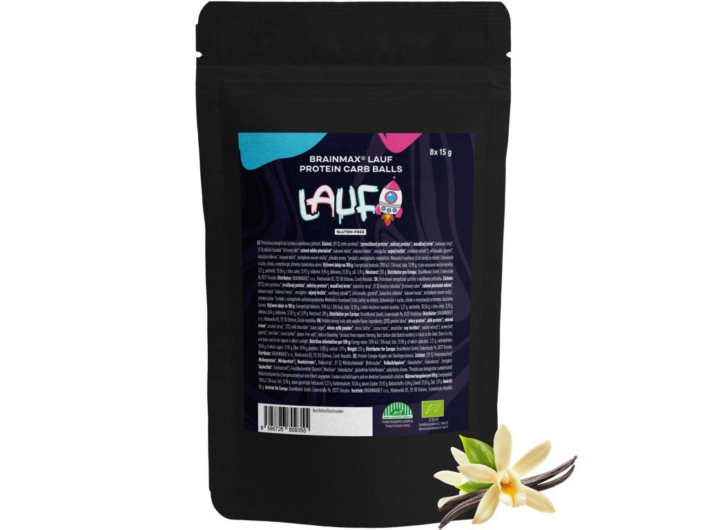 LAUF kuličky: Energie, co tě posune dál! LAUF kuličky jsou vyrobeny z prvotřídní směsi BIO syrovátkového a BIO mléčného proteinu. Tyto proteiny pocházejí od volně pasoucích se krav, které žijí přirozeně a nejsou vystaveny antibiotikům ani hormonům. Díky kompletnímu aminokyselinovému spektru jsou LAUF kuličky skvělým zdrojem kvalitních bílkovin, které podpoří váš aktivní životní styl a dodají energii kdykoliv během dne. Bez syntetických sladidel 100% BIO ingrediencí 4 g bílkovin v každé kuličce Jednoduché složení a vynikající chuť! LAUF kuličky obsahují bezlepkové BIO vločky, které jsou skvělým zdrojem komplexních sacharidů. Tyto sacharidy dodávají tělu energii, která se uvolňuje postupně, takže vás podpoří při sportu, výstupech nebo jakékoliv fyzické aktivitě. Každá kulička navíc obsahuje 4 g bílkovin, které přispívají k dlouhodobému pocitu sytosti, což z nich dělá ideální svačinu pro váš náročný den. 100% BIO ingrediencí Kuličky obsahují pouze ingredience organického původu. Certifikace zaručuje, že při pěstování nebyly použity pesticidy, syntetické herbicidy anebo hnojiva. BIO surovinám dáváme ve výrobcích zelenou! Výživové hodnoty na 100 g Energetická hodnota 1398 kJ/ 334 kcal Tuky 13,98 g - z toho nasycené mastné kyseliny 3,27 g Sacharidy 30,06 g - z toho cukry 21,92 g Vláknina 8,94 g Bílkoviny 27,8 g Sůl 3,91 g BIO certifikace CZ-BIO-001 Naše kuličky mají BIO certifikát - Produkce ekologického zemědělství EU. Nákupem podpoříte i české lesy #stromzaobjednavku! Složení: (29 %) směs proteinů* (syrovátkový protein*, mléčný protein*), mandlový krém*, kokosový sirup*, (11 %) mléčná čokoláda* (třtinový cukr*, sušené mléko plnotučné*, kakaové máslo*, kakaová hmota *, emulgátor: sojový lecitin*, vanilkový extrakt*), zvlhčovadlo: glycerol*, kukuřičná vláknina*, kakaové máslo*, bezlepkové ovesné vločky*, přírodní aroma. *produkt z ekologického zemědělství. *produkt z ekologického zemědělství. Minimální trvanlivost (číslo šarže) na etiketě. Distributor: BRAINMARKET s.r.o., Vítkovice 3053, 703 00 Ostrava, Česká republika. Skladování: Uchovávejte v suchu a nevystavujte přímému slunečnímu záření. Hmotnost: 120 g (8 x 15 g)Doplňkové parametry