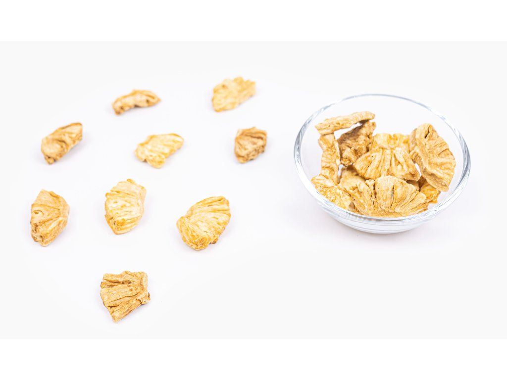 BIO původ pro vyšší dávku vitamínů bez chemie Ananas je známý pro svou přirozeně sladkou chuť a rozmanité přírodní složky, včetně vitamínu C, kyseliny listové, manganu či enzymu bromelainu, který mu dodává typické aroma a chuť. Náš ananas je sušený mrazem v BIO kvalitě a neobsahuje pesticidy ani těžké kovy, neboť je vypěstovány v ekologickém zemědělství. Chuť čerstvého ananasu díky lyofilizaci Lyofilizace je šetrný způsob sušení ovoce mrazem, kdy dochází k odstranění veškeré vody z plodů. Zůstává uchována chuť, barva i důležité vitamíny a minerály. Oproti sušenému ovoci chutnají lyofilizované plody jako čerstvé! BrainPedia.cz - místo nabité informacemi! Se správnými informacemi nelze udělat špatné rozhodnutí. Výživové hodnoty na 100 g Energetická hodnota 1612 kJ / 380 kcal Tuky < 0,5 g - z toho nasycené mastné kyseliny < 0,1 g Sacharidy 87 g - z toho cukry 85 g Vláknina 7,9 g Bílkoviny 3 g Sůl <0,01 g BIO certifikace CZ-BIO-001 Náš lyofilizovaný ananas má BIO certifikát - Produkce ekologického zemědělství EU. Nákupem podpoříte i české lesy #stromzaobjednavku! Složení: 100% BIO lyofilizovaný ananas Původ: Srí Lanka Distributor: BRAINMARKET s.r.o., Vítkovice 3053, 703 00 Ostrava, Česká republika. Skladování: Při pokojové teplotě, na suchém a tmavém místě. Hmotnost: 45 gDoplňkové parametry