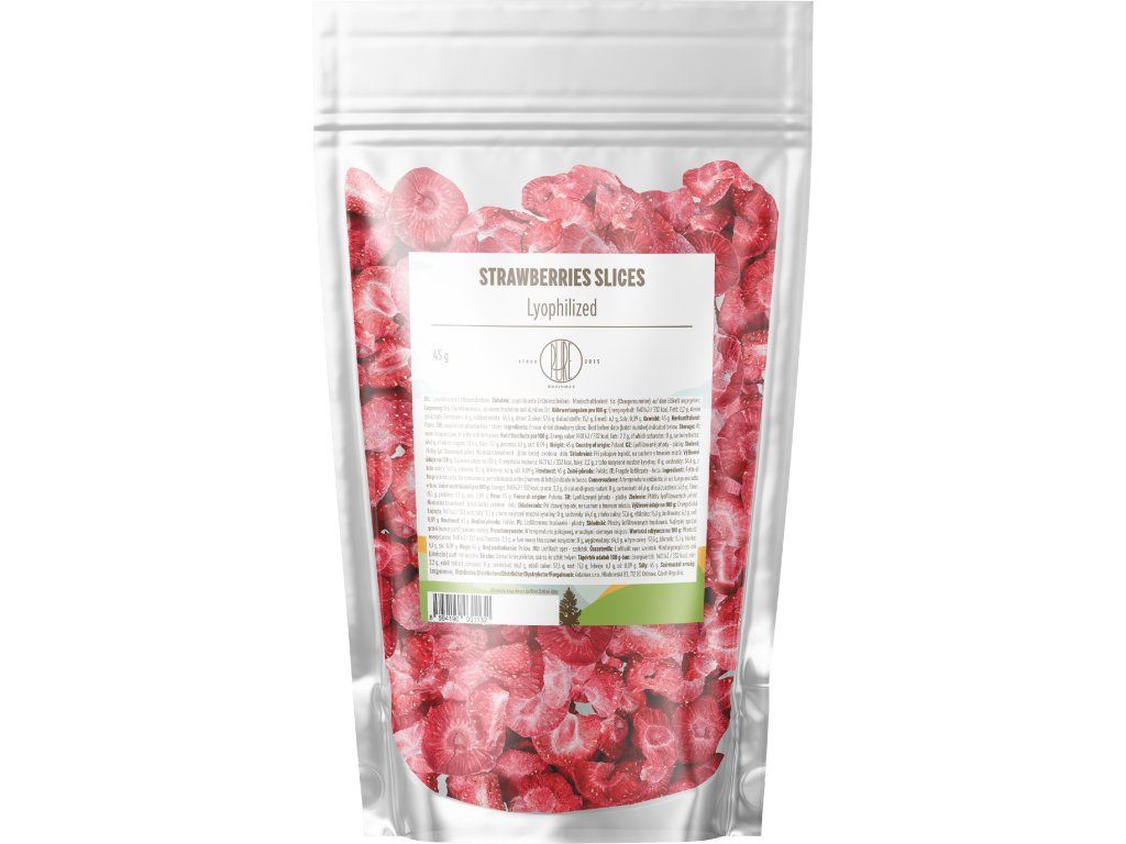 BrainMax Pure Lyofilizované jahody, plátky, 45 g Jahody jsou sladké červené plody jahodníku, které mají ve výživě své nezastupitelné místo. Kromě přirozeně vysokého obsahu vitamínu C, jsou také bohaté na vlákninu a další bioaktivní látky. Jejich výrazná červená barva pochází z antokyanů – rostlinných barviv ze skupiny flavonoidů. Jahody navíc obsahují i další cenné mikronutrienty, jako jsou vitamíny A, E, K a minerály, například draslík a mangan. Přednosti BrainMax Pure lyofilizovaných jahod: Maximální chuť. Vysoký obsah antokyanů. Zachování zdraví prospěšných látek. Bez chemie a přísad. Po namočení jako čerstvé ovoce. 100% RAW, VEGAN. Sušeno mrazem. Možnosti použití jahod: 2 lžíce přidejte do své oblíbené snídaňové misky nebo kaše. Můžete přidat do proteinového šejku nebo svého oblíbeného smoothie. Jahody se hodí i do jogurtu nebo studených, ale i pečených dezertů. Přednosti BrainMax Pure jahod Vitamínová bomba Zdroj vlákniny Šetrné zpracování Nákupem podpoříte i české lesy #stromzaobjednavku! Složení: 100% lyofilizované jahody Původ: Polsko Distributor: BRAINMARKET s.r.o., Vítkovice 3053, 703 00 Ostrava, Česká republika. Skladování: V suchu, v uzavřeném obalu. Hmotnost: 45 g Výživové údaje na 100 g Energetická hodnota 1401 kJ / 332 kcal Tuky 2,2 g - z toho nasycené mastné kyseliny 0 g Sacharidy 64,6 g - z toho cukry 57,6 Vláknina 15,1 g Bílkoviny 6,1 g Sůl 0,09 gDoplňkové parametry