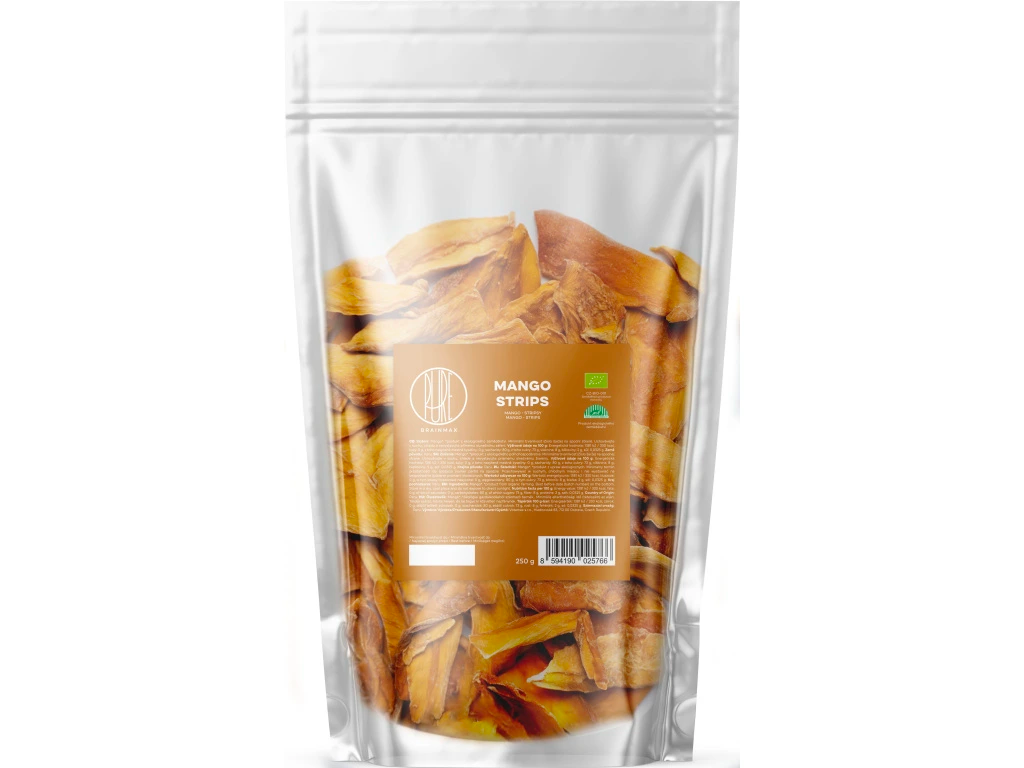 BrainMax Pure Mango, BIO, stripsy 250 g BrainMax Pure Mango stripsy v BIO kvalitě pochází z ekologického zemědělství a jsou šetrně sušeny bez přidaného cukru a konzervantů. Obsahuje rovněž vlákninu, minerální látky jako hořčík, draslík a železo. Díky své jemně sladké chuti a měkké konzistenci jsou ideální jako zdravá svačina nebo přísada do kaší či müsli. Přednosti BrainMax Pure Manga BIO stripsů: Přirozená sladká chuť bez přidaného cukru. Sušeno šetrným způsobem pro zachování chuti. Vhodné jako součást vyváženého jídelníčku. 100% BIO, VEGAN. Země původu: Peru. Možnosti použití Manga Přidejte do své oblíbené snídaňové misky nebo kaše. Můžete přidat do proteinového šejku, nebo svého oblíbeného smoothie či jogurtu. Mango se hodí i do studených, ale i pečených dezertů. BIO certifikace CZ-BIO-001 Naše Mango má BIO certifikát - Produkce ekologického zemědělství mimo EU. Nákupem podpoříte i české lesy #stromzaobjednavku! Výživové údaje na 100 g Energetická hodnota 1381 kJ/ 330 kcal Tuky 0 g - z toho nasycené mastné kyseliny 0 g Sacharidy 80 g - z toho cukry 73 g Vláknina 8 g Bílkoviny 2 g Sodík 19 mg Složení: 100% BIO Mango (Magnifera indica) Původ: Peru Distributor: BRAINMARKET s.r.o., Vítkovice 3053, 703 00 Ostrava, Česká republika. Skladování: V suchu, v uzavřeném obalu. Hmotnost: 250 gDoplňkové parametry
