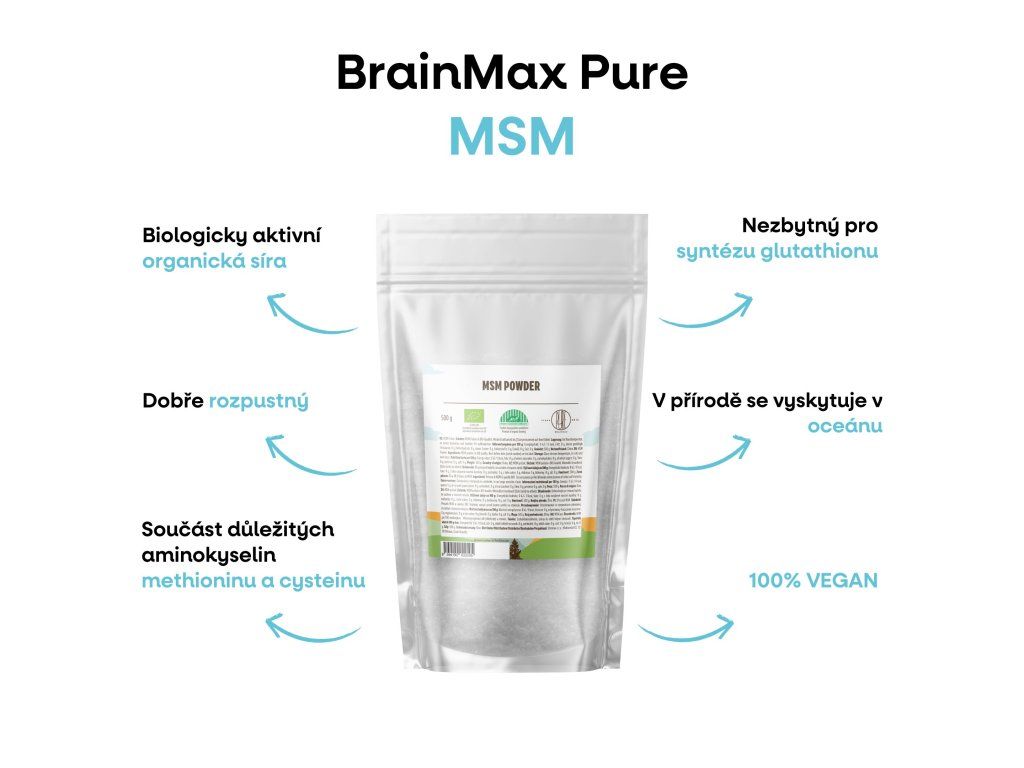 BrainMax Pure MSM prášek je organická forma síry, známá jako methylsulfonylmethan. Tato forma je běžně přítomná v těle a zajišťuje optimální vstřebatelnost síry.