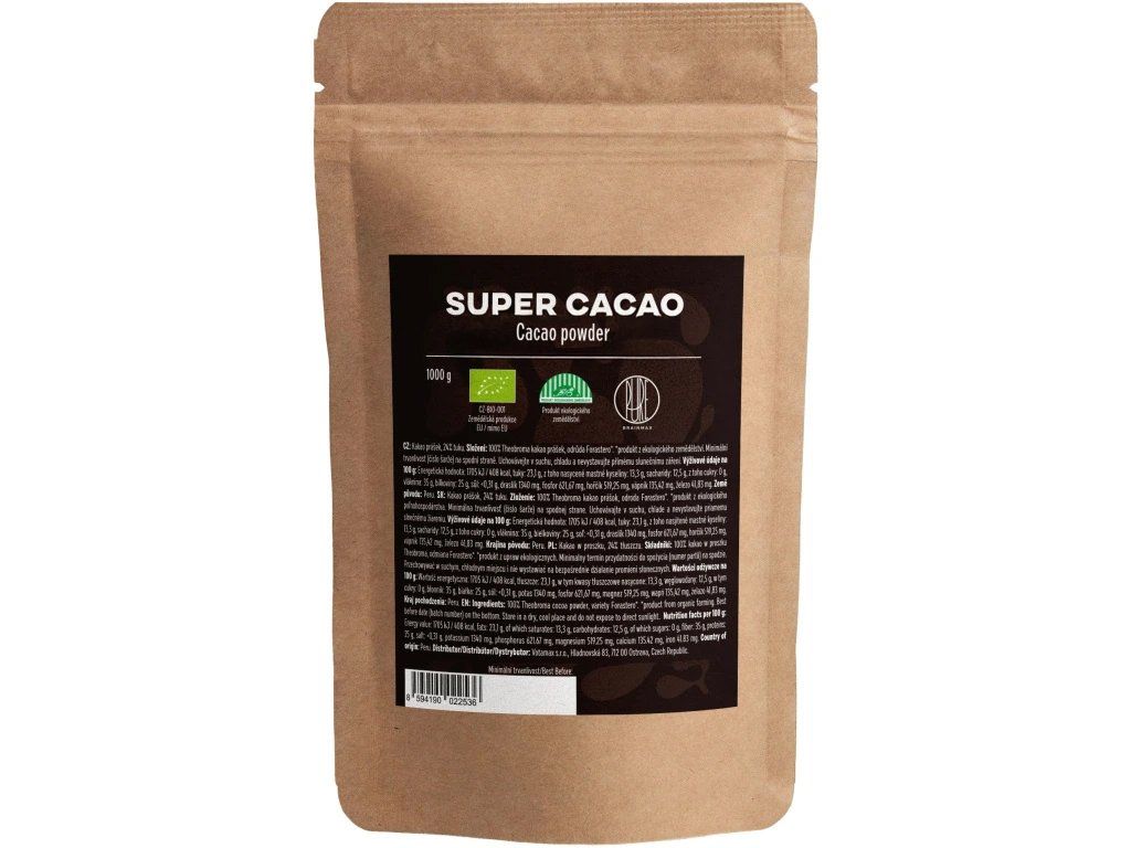 BrainMax Pure Organic Super Cacao, BIO, kakao, 1000 g Kakaové boby, ze kterých vzniká kakao, jsou plody rostliny Theobroma cacao, což v řečtině znamená "pokrm bohů". A není divu. V oblasti Střední a Jižní Ameriky bylo původními obyvateli kakao velice ceněno. Už před 3000 lety se kakao používalo jako jídlo, lék nebo i měna. Dodnes existují kmeny, ve kterých je kakao ceněno jako posvátný nápoj. Kakao je vynikající rostlinný zdroj železa. Nicméně kromě železa kakao obsahuje také hořčík. Mimo to je kakao skvělým zdrojem serotoninu, tryptofanu, tyrosinu a fenylethylaminu. Tyto neurotransmitery jsou spojovány s příjemnými pocity. Organické kakao vzniká z plodů rostliny kakaovníku pravého (kakaových bobů), které mají antioxidační vlastnosti.1 Přednosti BrainMax Pure Super kakaa: Vysoký obsah zdravých tuků (21%) Bohaté na polyfenoly a theobromin Zdroj železa, zinku, hořčíku, draslíku, fosforu, mědi a vápníku 100% BIO, VEGAN, Non-GMO Země původu: Peru Možnosti použití kakaa Můžete přidat do proteinového šejku nebo svého oblíbeného smoothie. Kakaový prášek je výborný na výroku horké čokolády, kakaových nápojů, do jogurtů, desertů, dortů Populární recepty s kakaem Brownies wafle Složení: 2 vejce 300 ml mléka 160 g žitné mouky 50 g hořké čokolády 85% 30 g kakaa 10 g chia semínek 1 lžíce prášku do pečiva 1 lžička skořice Postup: V míse si vyšleháme vejce společně s mlékem. Přidáme mouku, chia semínka, rozpuštěnou čokoládu, kakao, med, prášek do pečiva a lžičku skořice. Tyčovým mixérem rozmixujeme směs na hladké těsto. Hotové těsto nalejeme do vaflovače a pečeme 3-4 minuty, záleží na druhu našeho waflovače. Vafle můžeme polít medem nebo podávat s jogurtem. Kakaový koláč Složení: 120 g celozrnné pšeničné mouky hladké 1 lžička kypřicího prášku do pečiva 15 g kakaa 75 g kokosového cukru 1 vejce 90 ml polotučného mléka 20 g kokosového oleje v tekutém stavu 250 g jablek (oloupaných a nastrouhaných nahrubo) 40 g vlašských ořechů (nadrcených najemno) 50 g čokolády na vaření (minimálně 55 % kakaa) Postup: Formu na koláč vyložte pečicím papírem. V míse smíchejte mouku, prášek do pečiva, kakao, kokosový cukr, vejce, mléko a olej a vše důkladně promíchejte tak, aby vzniklo hladké těsto. Těsto vložte do připravené formy na dort a rovnoměrně rozprostřete. Poté těsto pokryjte nahrubo nastrouhanými jablky a posypte najemno nadrcenými ořechy. Formu s těstem vložte do předehřáté trouby a pečte 35–40 minut při 180–185 °C. Jakmile se koláč upeče, rozpusťte čokoládu nad vodní lázní a poté pomocí lžíce pokapejte povrch koláče. Kakaové muffiny s borůvkami Složení: 1 vejce kelímek zakysané smetany 45 gramů rozměklého másla 55 gramů kokosového cukru 25 kakaa 125 gramů hladké mouky balíček prášku do pečiva lžička jedlé sody dvě řady kvalitní hořké čokolády dvě až tři hrsti borůvek Postup: V míse rozšlehejte vejce s máslem, cukrem nakonec přidejte i zakysanou smetanu. V druhé míse smíchejte mouku, sodu, prášek do pečiva a kakao. Tuto sypkou směs postupně přisypávejte do mísy s tekutou směsí a šlehejte, dokud se všechny ingredience nespojí v těsto. Do těsta přimíchejte borůvky. Můžete je předtím v misce promíchat s trochou krystalového cukru, aby nebyly kyselé. Nakonec nalámejte či nakrájejte čokoládu na kousky a přimíchejte je do těsta. Teflonovou nebo silikonovou formu na muffiny vyložte košíčky a naplňte je ze tří čtvrtin těstem. Pečte v troubě vyhřáté na 200 stupňů asi 20 minut. Výživové hodnoty na 100 g Energetická hodnota 471 kcal / 1 972 kJl Tuky 21 g - z toho nasycené mastné kyseliny 12,5 g Sacharidy 46,75 g - z toho cukry 0 g Bílkoviny 23,8 g Vláknina 32,5 g Sodík 28 mg Vápník 124,1 mg Železo 12 mg Draslík 1,36 g BIO certifikace CZ-BIO-001 Naše kakao má BIO certifikát - Produkce ekologického zemědělství mimo EU. Nákupem podpoříte i české lesy #stromzaobjednavku! Složení: 100% organické kakao (Theobroma cacao) Legenda: 1Zdravotní tvrzení o antioxidačních vlastnostech se vztahuje k plodům kakaovníku pravého a je uvedeno na on hold seznamu ve smyslu nařízení (ES) č. 1924/2006, o výživových a zdravotních tvrzeních při označování potravin. Původ: Peru Distributor: BRAINMARKET s.r.o., Vítkovice 3053, 703 00 Ostrava, Česká republika. Skladování: V suchu, v uzavřeném obalu. Hmotnost: 1000 gDoplňkové parametry