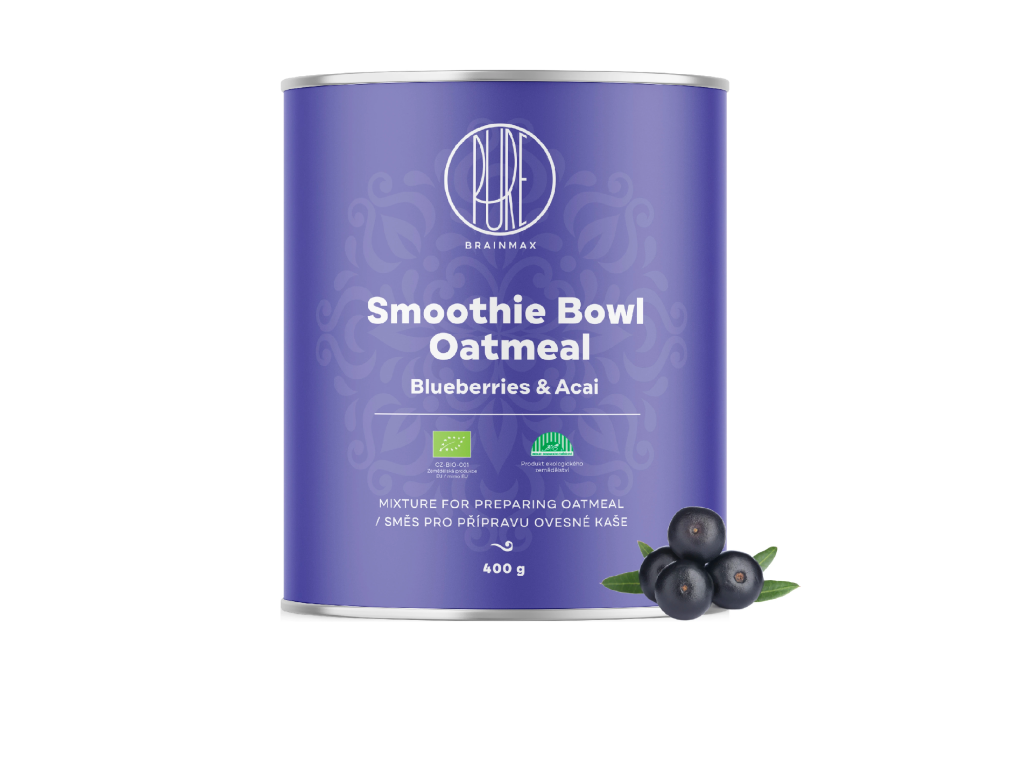 Ovesná kaše – rychlá a výživná snídaně Potřebujete výživnou a chutnou snídani hotovou doslova za pár minut? BrainMax Pure BIO ovesná kaše s acai a borůvkami je tu přesně pro vás! Kombinace bezlepkových vloček, lyofilizovaného ovoce a chia semínek vás příjemně zasytí a přirozeně nastartuje do nového dne. Přirozený obsah vlákniny a rostlinných složek dělá z této kaše ideální volbu pro rychlou, čistou a chutnou snídani. Bez přidaného cukru Superpotravinová směs BIO kvalita Přednosti BrainMax Pure Ovesné kaše, acai a borůvky Superpotravinová směs –Acai, borůvky a baobab jsou plody přirozeně bohaté na cenné rostlinné látky a poskytují řadu benefitů. Bez přidaného cukru – Přírodní sladkost z datlového a banánového prášku Rychlá příprava – Stačí rozmíchat 50 g směsi v teplém mléce nebo rostlinném nápoji a máte hotovo! Bezlepková a 100% BIO kvalita – Pouze čisté přírodní suroviny pro maximální nutriční přínos. Přirozený zdroj energie a vysoký obsah vlákniny – Ideální pro sytou snídani. Příprava 50 g směs rozmíchejte ve 100 ml teplého mléka. Výživové hodnoty na 100 g Energetická hodnota 1548 kJ / 370 kcal Tuky 7,63 g - z toho nasycené mastné kyseliny 1,23 g Sacharidy 58,97 g - z toho cukry 15,21 g Bílkoviny 10,26 g Vláknina 12,27 g Sůl 0,01 g Výživové hodnoty na porci 50 g Energetická hodnota 774 kJ / 185 kcal Tuky 3,81 g - z toho nasycené mastné kyseliny 0,62 g Sacharidy 29,48 g - z toho cukry 7,60 g Bílkoviny 5,13 g Vláknina 6,13 g Sůl 0,00 g BIO certifikace CZ-BIO-001 Naše Smoothie bowl má BIO certifikát - Produkce ekologického zemědělství mimo EU. Nákupem podpoříte i české lesy #stromzaobjednavku! Složení: bezlepkové ovesné vločky* (obsah lepku maximálně 20 mg/kg), datlový prášek*, bezlepková ovesná mouka* (obsah lepku maximálně do 20 mg/kg), banánový prášek*, chia semínka*, borůvkový lyofilizovaný prášek*, acai prášek*, baobab prášek*. * produkt z ekologického zemědělství. Obsahuje 100 % surovin v BIO kvalitě. Výrobek může obsahovat stopy mléka, skořápkových plodů a arašídů. Původ: EU/ mimo EU. Vyrobeno v České republice. BRAINMARKET s.r.o., Vítkovice 3053, 703 00 Ostrava, Česká republika. Balení obsahuje 8 porcí. Skladování: Uchovávejte v suchu, chladu a nevystavujte přímému slunečnímu záření. Po otevření spotřebujte do dvou měsíců nebo do data trvanlivosti. Hmotnost: 400 gDoplňkové parametry