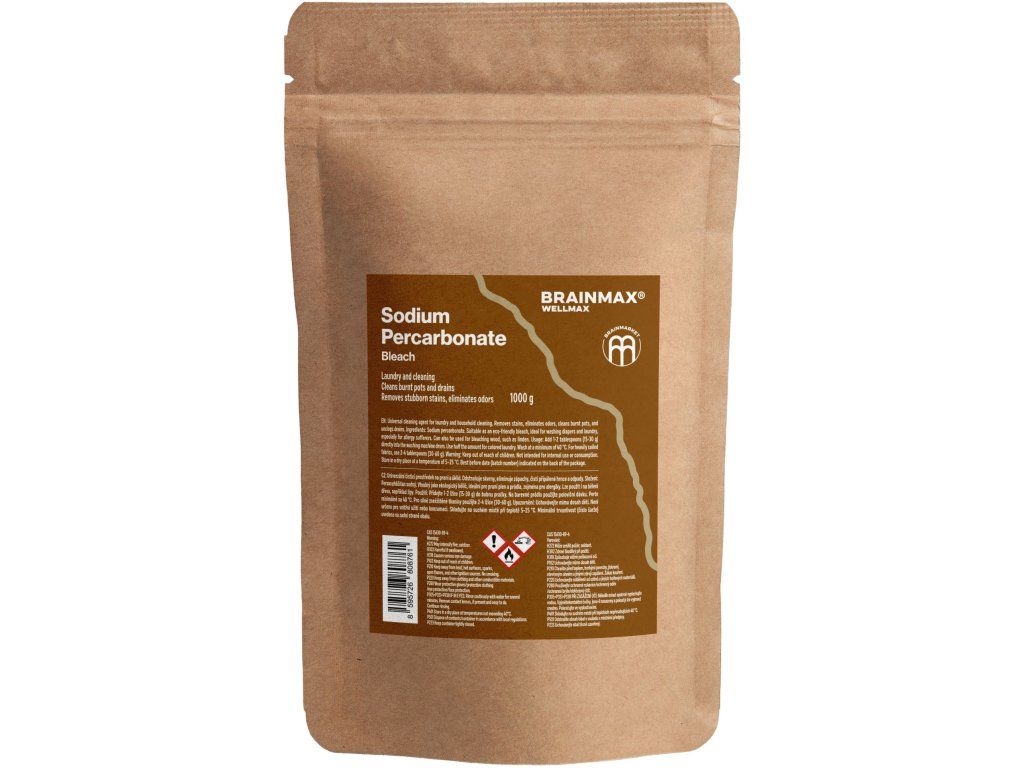 Proč zvolit WellMax Perkarbonát sodný? Efektivní bělení bez chloru a šetrnost k citlivé pokožce v jednom. Během praní se WellMax Perkarbonát sodný rozkládá na sodu a peroxid, což zajišťuje účinné bělení bez použití chloru. Díky tomu zůstává vaše prádlo zářivě bílé a povrchy čisté. Tento produkt je navíc šetrný k citlivé pokožce a vhodný pro osoby s alergiemi. Univerzální použití WellMax Perkarbonát sodný nabízí široké spektrum využití: Vylepšete bělicí účinek: Přidejte WellMax perkarbonát sodný do vašeho běžného pracího prostředku a perte alespoň na 60 °C. Vaše prádlo bude zářit jasněji než kdy předtím. Oživte znečištěné plochy: Posypte perkarbonátem znečištěné povrchy jako jsou vany, umyvadla, spáry nebo obklady, zalijte vodou nebo bílým octem, nechte chvíli působit a poté spláchněte. Vaše plochy budou opět čisté a svěží. Zbavte se ucpaných odpadů snadno: Nasypte 1–2 lžíce perkarbonátu do odtoku, přidejte teplý bílý ocet a nechte směs působit alespoň 15 minut. Na závěr propláchněte vroucí vodou. Odpady budou opět fungovat bez ucpání. Obnovte čistotu WC: Smíchejte 1–2 lžíce perkarbonátu s horkou vodou a nalijte směs do WC. Pro efektivní odstranění vodního kamene nechte působit přes noc a přidejte trochu bílého octa. Vaše WC bude opět zářit čistotou. Připravte si domácí prášek do myčky: Smíchejte 2 lžičky perkarbonátu s 1 lžičkou kyseliny citronové a nasypte do zásobníku myčky. Nádobí bude dokonale čisté a bez námahy. Jak WellMax perkarbonát skladovat? WellMax Perkarbonát sodný je balen v praktickém 1 kg balení. Můžete si ho přesypat do sklenice určené pro jeho uchování, která vám usnadní přístup a použití. BrainPedia.cz - místo nabité informacemi! Se správnými informacemi nelze udělat špatné rozhodnutí. Nákupem podpoříte i české lesy #stromzaobjednavku! Upozornění: Uchovávejte mimo dosah dětí. Není určeno k vnitřnímu použití nebo konzumaci. Distributor: BRAINMARKET s.r.o., Vítkovice 3053, 703 00 Ostrava, Česká republika. Skladování: Na suchém místě při teplotě 5-25°C. Obsah: 1000 gDoplňkové parametry