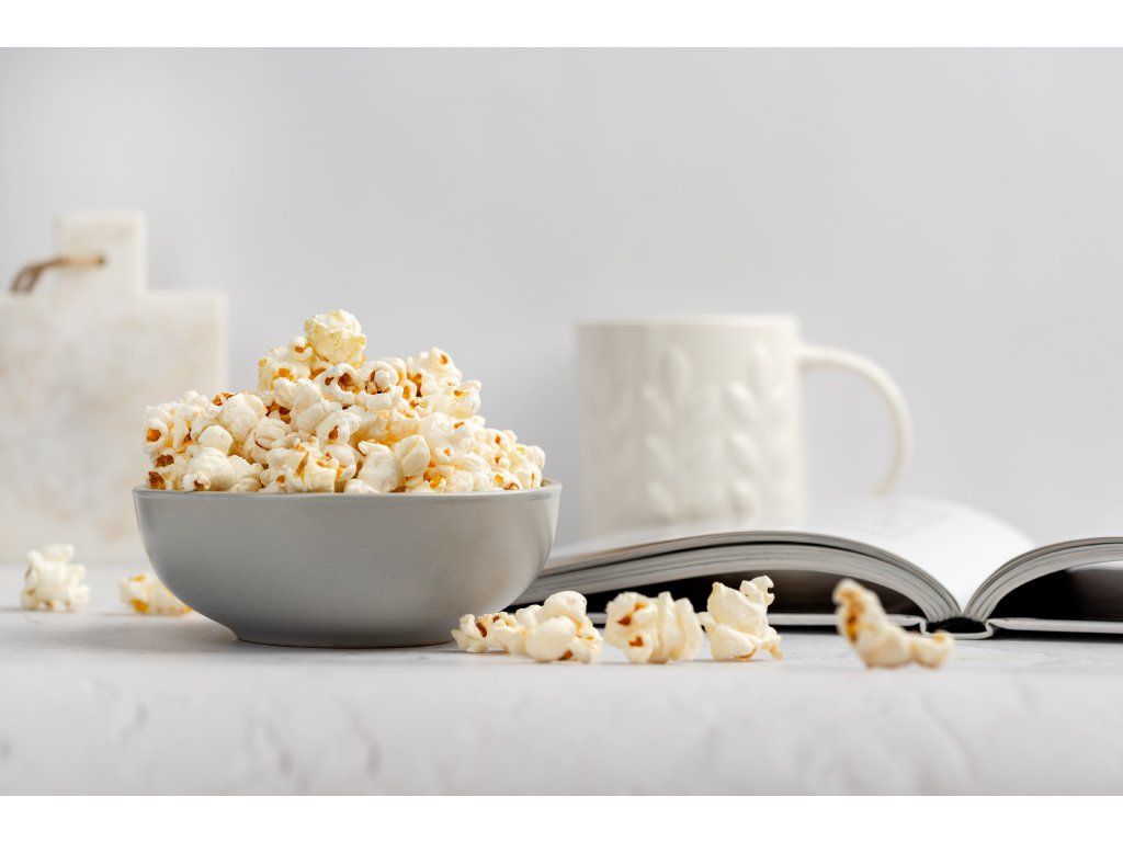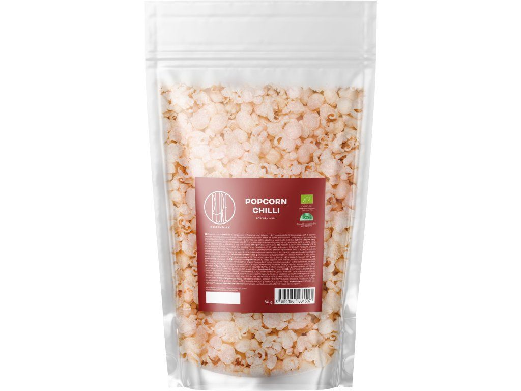Slaný tak akorát! Náš popcorn je pražený na BIO kokosovém oleji a jemně ochucený růžovou himalájskou solí. Oproti běžné kuchyňské soli přirozeně obsahuje i stopové množství minerálních látek. Pro milovníky netradičních chutí máme kromě slané klasiky i dvě originální příchutě – kečup, který popcornu dodává příjemnou sladkokyselou rajčatovou chuť, a chilli, ve kterém se snoubí křupavost s lehkou pikantností díky BIO španělským papričkám. Všechny použité suroviny pocházejí z ekologického zemědělství. Výživové údaje na 100 g Slaný Na 100 g Energetická hodnota 444 kcal/1813 kJ Tuky 18,98 g - z toho nasycené mastné kyseliny 14,84 g Sacharidy 58,20 g - z toho cukry 0,70 g Vláknina 9,92 g Bílkoviny 8,59 g Sůl 6,01 g Složení: (78 %) kukuřice zrna*, kokosový olej*, (6 %) himalájská sůl. *produkt z ekologického zemědělství. Výživové na 100 g Chilli Na 100 g Energetická hodnota 461 kcal/1926 kJ Tuky 18,99 g - z toho nasycené mastné kyseliny 14,96 g Sacharidy 64,70 g - z toho cukry 6,82 g Vláknina 9,93 g Bílkoviny 9,25 g Sůl 6,04 g Složení: (89 %) slaný popkorn (kukuřice zrna*, kokosový olej*, himalájská sůl), (6 %) kokosový cukr*, (5 %) chilli*. *produkt z ekologického zemědělství. Výživové údaje na 100 g Kečup Na 100 g Energetická hodnota 470 kcal/1962 kJ Tuky 19,03 g - z toho nasycené mastné kyseliny 14,96 g Sacharidy 66,63 g - z toho cukry 8,62 g Vláknina 10,04 g Bílkoviny 9,38 g Sůl 6,04 g Složení: (75 %) slaný popkorn (kukuřice zrna*, kokosový olej*, himalájská sůl), (16 %) rajčatový prášek*, (9 %) kokosový cukr*. *produkt z ekologického zemědělství. BIO certifikace CZ-BIO-001 Náš popcorn má BIO certifikát - Produkce ekologického zemědělství EU/mimo EU. Nákupem podpoříte i české lesy #stromzaobjednavku! Původ: EU/mimoEU. Vyrobeno v ČR. Distributor: BRAINMARKET s.r.o., Vítkovice 3053, 703 00 Ostrava, Česká republika. Skladování: Uchovávejte v suchu a nevystavujte přímému slunečnímu záření. Po otevření spotřebujte do 2 měsíců. Hmotnost: 80 gDoplňkové parametry
