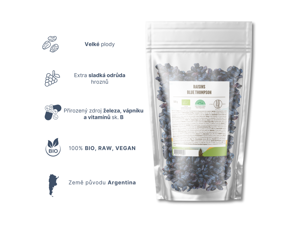 BrainMax Pure Rozinky Blue Thompson BIO, 500g Rozinky neboli kishmish, byly objeveny 2000 let před našim letopočtem. Rozinky jsou více než jen zdrojem energie, ale přirozeně obsahují i nezanedbatelné množství vlákniny, železa, hořčíku, draslíku a vápníku. Rozinky jsou prostě nabité minerály. Rozinkami si můžete obohatit ranní kaši, nebo si je sebou vzít jako svačinu na cesty. Slovo „Rozinky“ je odvozeno z latinského slova „Racemose“, což znamená hrozen. Organické rozinky mají různé velikosti a tvary a vyrábějí se sušením hroznů. Obvykle jsou žluté, hnědé nebo fialové barvy. Rozinky fungují jako přírodní sladilo. Můžou být tedy součástí Raw pochoutek, nebo i sladkých dezertů. Přednosti BrainMax Pure Rozinky BIO: 100% BIO, RAW, VEGAN. Přirozený zdroj vlákniny a minerálů. Extra sladká odrůda hroznů. Země původu: Argentina Možnosti použití Rozinek Přidání do snídaňových kaší nebo Raw energetických tyčinek. Můžete přidat do jogurtu. Klasická součást pečení sladkých dezertů. Přednosti BrainMax Pure Rozinek Přirozený obsah minerálů Přirozený zdroj vlákniny Přirozený zdroj energie BIO certifikace CZ-BIO-001 Náš Rozinky maji BIO certifikát - Produkce ekologického zemědělství mimo EU. Nákupem podpoříte i české lesy #stromzaobjednavku! Složení: 100% BIO Rozinky Původ: Argentina Distributor: BRAINMARKET s.r.o., Hladnovská 83/93, Ostrava Skladování: V suchu, v uzavřeném obalu. Hmotnost: 500 gDoplňkové parametry