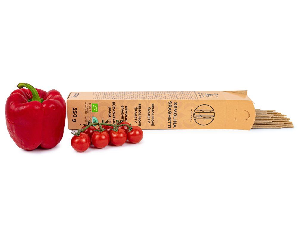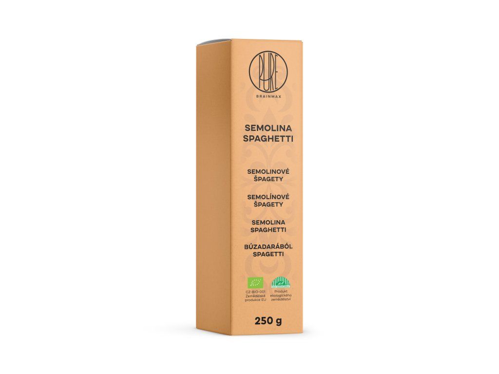 Výborná konzistence i chuť. BrainMax Pure Špagety jsou vyrobeny z tvrdozrnné pšenice, tzv. semoliny,která těstovinám dodává pevnost, pružnost a brání jejich rozvaření. Jsou vyrobeny z celých zrn, proto mají vysoký obsah vlákniny a jsou zdrojem bílkovin, což z nich dělá výživově hodnotnou přílohu i hlavní chod. Těstoviny jsou v certifikované BIO kvalitě, což znamená, že při pěstování nebyly použity syntetické pesticidy ani herbicidy. Špagety z tvrdozrnné pšenice Semolina je tvrdozrnná pšenice, která představuje pouze asi 8% celosvětové produkce pšenice. Těstoviny si lépe udržují ideální konzistenci a to je jedna z výhod, proč je semolina využívaná pro výrobu prémiových těstovin. Špagety je vhodné připravit s přidáním BrainMax Pure Olivový olej Premium BIO. Výborně se hodí k rajčatovým nebo krémovým omáčkám, nebo jako prvotní surovina k přípravě tradičního receptu Aglio olio. Příprava Špagety vložte do osolené vroucí vody a vařte zhruba 8 minut. Díky konzistenci semolinových těstovin je opravdu uvaříte al dente a hodí se do každého receptu. Skvělá kombinace chuti a výživných látek Semolina neboli tvrdozrnná pšenice je unikátní svým obsahem vlákniny, protože je z tohoto druhu pšenice využité celé zrno. Navíc mají těstoviny po uvaření tu správnou konzistenci. Špagety se nerozvaří ani nelepí k sobě. BrainPedia.cz - místo nabité informacemi! Se správnými informacemi nelze udělat špatné rozhodnutí. Recepty s tímto produktem Špagety s piniovými oříšky a špenátem Výživové hodnoty na 100 g Energetická hodnota 1465 kJ / 350 kcal Tuky 1,2 g - z toho nasycené mastné kyseliny 0,2 g Sacharidy 75 g - z toho cukry 6,7 g Vláknina 2,6 g Bílkoviny 10,5 g Sůl 0,005 g BIO certifikace CZ-BIO-001 Naše špagety mají BIO certifikát - Produkce ekologického zemědělství mimo EU. Nákupem podpoříte i české lesy #stromzaobjednavku! Složení: 100% tvrdá pšeničná krupice, pitná voda. Vyrobeno v závodě zracovávajícím sojový olej. Vyrobeno v Itálii. Obsahují lepek. Původ: Itálie Distributor: BRAINMARKET s.r.o., Vítkovice 3053, 703 00 Ostrava, Česká republika. Skladování: V suchu, v uzavřeném obalu. Hmotnost: 250 gDoplňkové parametry
