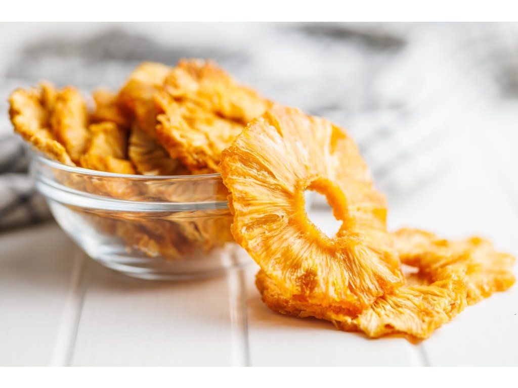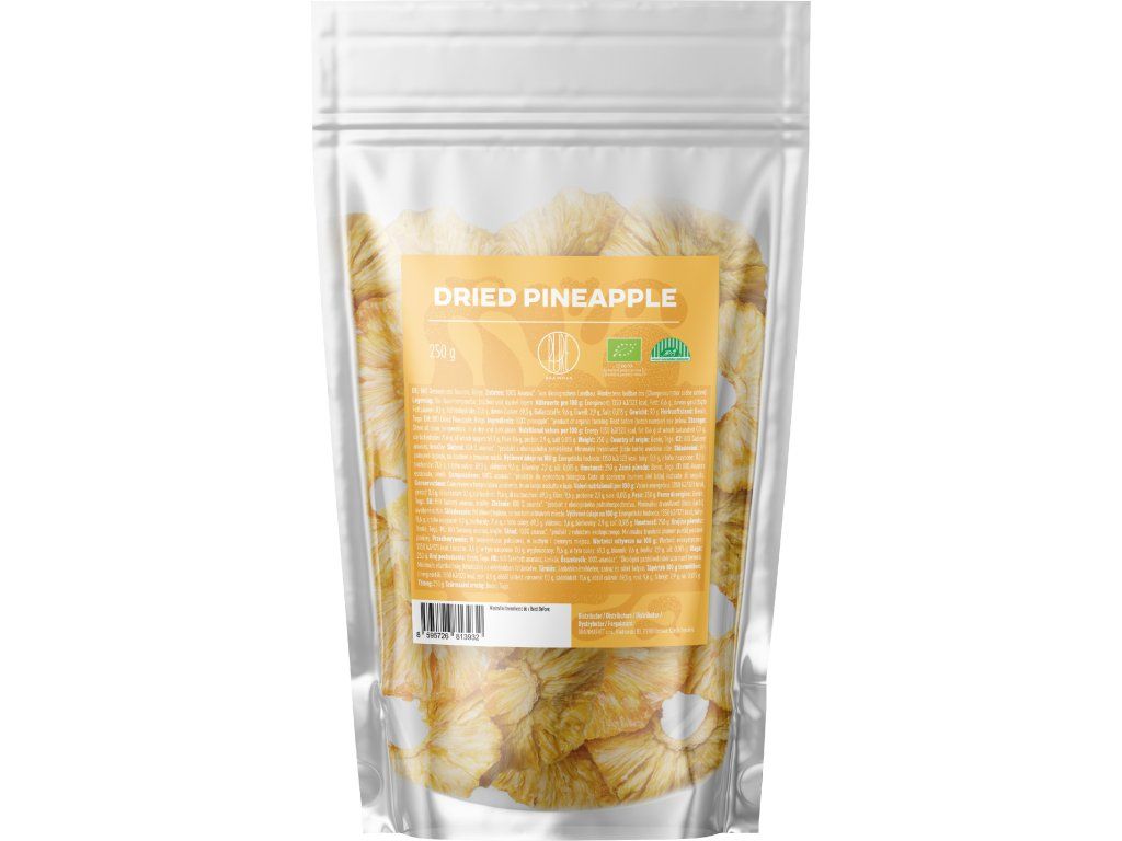 BrainMax Pure Sušený ananas, BIO, kroužky 250 g Ananas je oblíbený tropický plod, jehož původ sahá do Jižní Ameriky. Dnes se pěstuje v mnoha tropických oblastech světa a Benin a Togo patří mezi lokality, kde se pěstuje v nejvyšší BIO kvalitě. Sušený ananas je skvělou volbou pro ty, kteří hledají čistě přírodní a výživnou svačinu s autentickou chutí. Když vás honí mlsná, zkuste něco lepšího! BrainMax Pure Sušený ananas v BIO kvalitě je zdrojem vitamínu C a dalších prospěšných látek. Obsahuje také bromelain, přirozeně se vyskytující enzym v ananasu. Díky přirozenému obsahu vlákniny je ideální volbou pro ty, kteří chtějí zařadit do stravy více ovoce ve své nejčistší podobě. BrainMax Pure Sušený ananas je 100% bez konzervantů, šetrně sušený a neobsahuje oxid siřičitý, přidaný cukr ani umělá aromata. Možnosti použití sušeného ananasu Přidejte do snídaňové kaše, müsli nebo granoly Skvělý do smoothie nebo jako přísada do domácích dezertů Zdravá svačina na cesty i do práce Lze přidat do pečených i nepečených sladkostí Přednosti BrainMax Pure Sušeného ananasu, BIO Tropická dávka vitamínu C Sušený ananas je skvělou alternativou čerstvého ovoce, když potřebujete rychlou a přírodní svačinu Obsahuje přírodní enzym bromelain Bromelain je enzym přirozeně přítomný v ananasu Bez přidaného cukru 100% čistý sušený ananas v BIO kvalitě, bez chemických přísad Výživové hodnoty na 100 g Energetická hodnota 1350 kJ / 323 kcal Tuky 0,6 g - z toho nasycené mastné kyseliny 0,1 g Sacharidy 71,6 g - z toho cukry 69,3 g Vláknina 9,6 g Bílkoviny 2,9 g Sůl 0,015 g Nákupem podpoříte i české lesy #stromzaobjednavku! Složení: 100% BIO ananas. Minimální trvanlivost (číslo šarže) uvedeno níže. Země původu: Benin, Togo Distributor: BRAINMARKET s.r.o., Vítkovice 3053, 703 00 Ostrava, Česká republika. Skladování: V suchu, v uzavřeném obalu Hmotnost: 250 gDoplňkové parametry