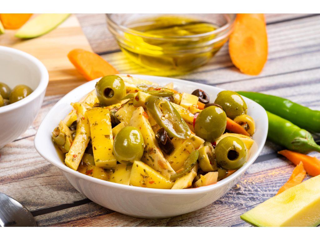 Olivy odrůdy konservolia Zelené olivy přirozeně obsahují rostlinné tuky – zejména mononenasycené mastné kyseliny, které jsou přirozenou součástí středomořské stravy. Najdeme v nich i malé množství vlákniny a řadu bioaktivních látek, včetně přírodních polyfenolů, které přispívají k výsledné chuti a barvě oliv. BrainPedia.cz - místo nabité informacemi! Se správnými informacemi nelze udělat špatné rozhodnutí. Výživové hodnoty na 100 g Energetická hodnota 661 kJ / 161 kcal Tuky 16,3 g - z toho nasycené mastné kyseliny 2,55 g Sacharidy 1,0 g - z toho cukry 0 g Vláknina 2,8 g Bílkoviny 1,3 g Sůl 5,4 g BIO certifikace CZ-BIO-001 Naše zelené olivy mají BIO certifikát - Produkce ekologického zemědělství EU. Nákupem podpoříte i české lesy #stromzaobjednavku! Složení: zelené olivy*, sůl, voda, regulátory kyselosti (kyselina mléčná a citronová). Může obsahovat pecky nebo stopy pecek. *produkt ekologického zemědělství. Bez konzervačních látek. Původ: Řecko Distributor: BRAINMARKET s.r.o., Vítkovice 3053, 703 00 Ostrava, Česká republika. Skladování: Minimální trvanlivost (číslo šarže) uvedena na víčku. Uchovávejte v suchu, chladu a nevystavujte přímému slunečnímu záření. Po otevření uchovávejte v chladu v původním obalu a spotřebujte do 30 dnů. Hmotnost: 370 gDoplňkové parametry