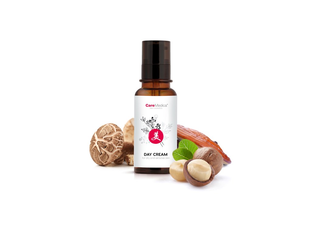 Denní krém pro suchou a citlivou pleť poskytuje dokonalou výživu a hydrataci. Houba reishi podporuje zdravý stav pokožky a má anti-aging účinky. Houba shiitake pokožku chrání a regeneruje. Mandlový olej pleť vyživuje a chrání před vysoušením, zjemňuje a osvěžuje. Zklidňuje podráždění a eliminuje případné zarudnutí pokožky a pocity napětí. Makadamiový olej má vynikající regenerační účinky, pokožku zvláčňuje a dodává tolik potřebnou hydrataci. Panthenol změkčuje pleť, zanechává ji vyhlazenou a navrací ji přirozenou rovnováhu.