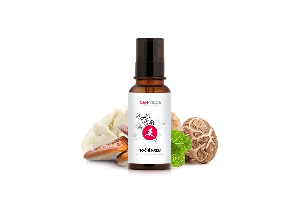 Noční krém pro suchou a citlivou pleť během spánku intenzivně vyživuje, hydratuje a napomáhá vyhlazení pokožky. Houba reishi podporuje její vitalitu a má anti-aging účinky. Houba shiitake zlepšuje stav pleti, zejména takové se sklony k zánětům. Mandlový olej zjemňuje vrásky a obsažený vitamín E podporuje regeneraci kožních buněk. Zklidňuje podráždění a eliminuje případné zarudnutí pokožky a pocity napětí. Bambucké máslo pleť zjemňuje, zvláčňuje, vyhlazuje a pomáhá její regeneraci. Podporuje produkci kolagenu a působí proti vlivům, které se podílí na předčasném stárnutí pokožky. Chrání buňky před působením oxidačního stresu.