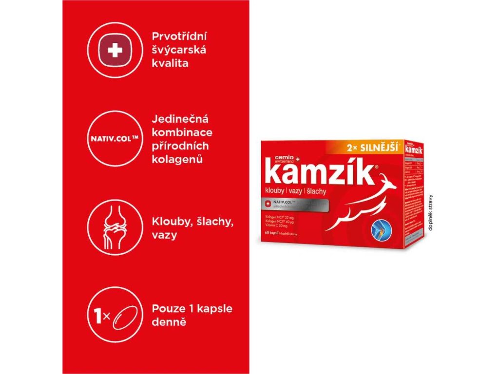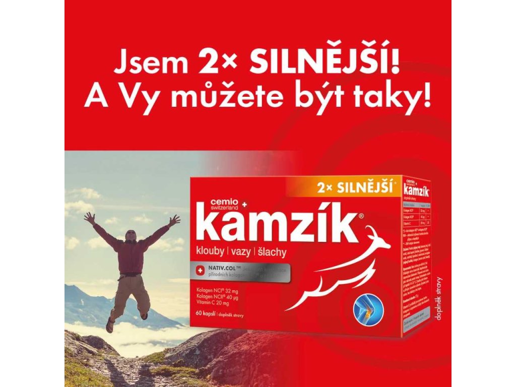 Cemio Kamzík® 2x Silnější na klouby, vazy a šlachy. Jedinečné přírodní kolageny NATIV.COL(TM): kolagen typu I jako hlavní součást vazů, šlach a kůže. Kolagen typu II, obsažený v kloubní chrupavce. Vitamin C je důležitý pro správou tvorbu kolagenu v kloubních chrupavkách.