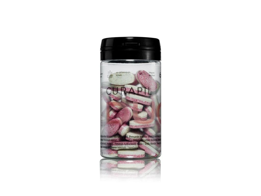 Doplněk stravy Curapil DUO s vylepšenou dvojí formulí Curapil Complex dodává tělu dostatek vitamínů a minerálů pro růst zdravých vlasů a pevných nehtů.