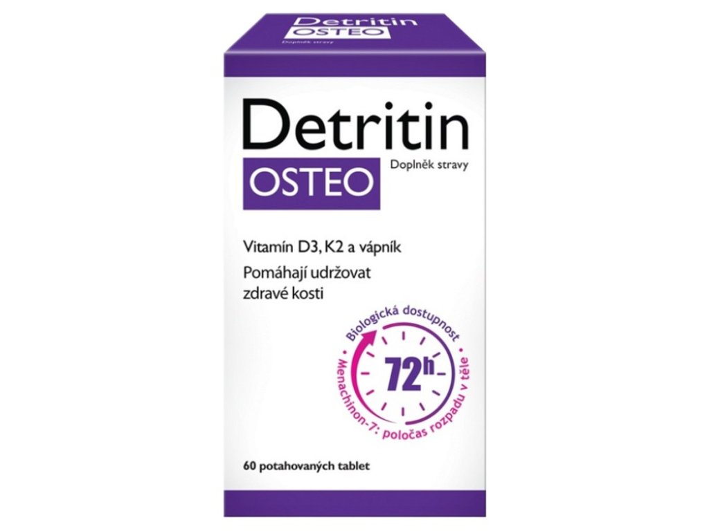 Detritin Osteo je komplexní přípravek navržený pro podporu zdraví kostí u dospělých, zejména u žen po menopauze a seniorů, u kterých přirozeně dochází k úbytku kostní hmoty. Základ tvoří vápník, který je nezbytný pro udržení normálního stavu kostí a zubů. U žen po menopauze pomáhá vápník snižovat úbytek kostního minerálu, který je jedním z rizikových faktorů osteoporózy.