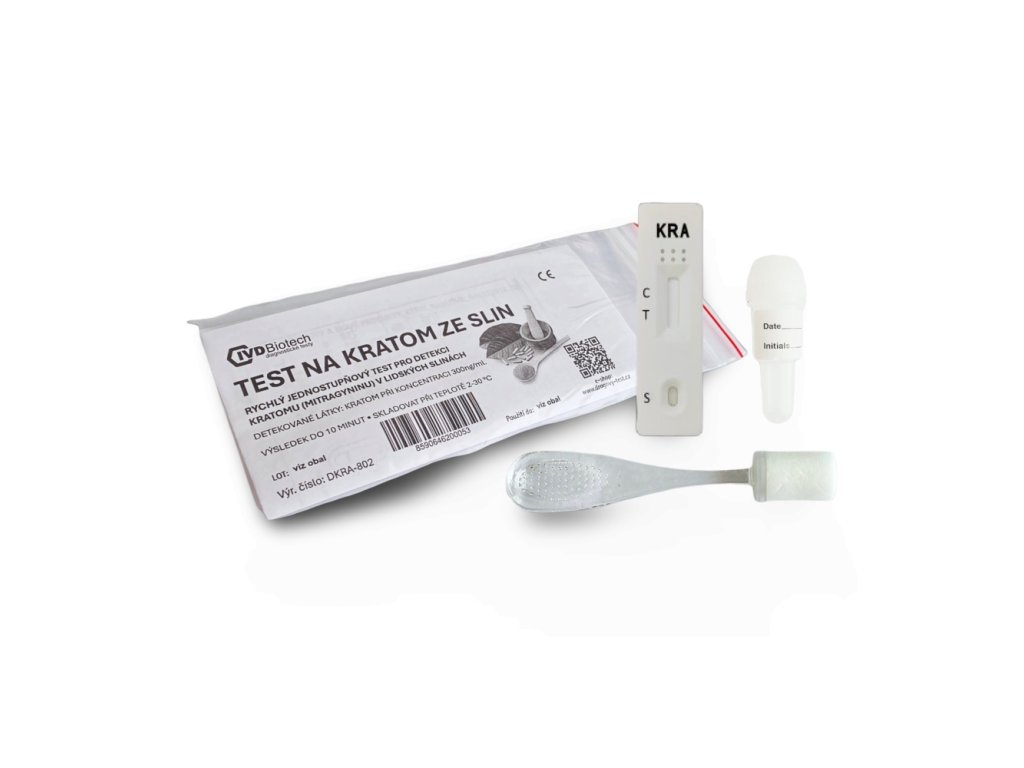 Jednorázový test na kratom ve formě kazety je kvalitní a rychlý orientační test, který pomáhá detekovat hladinu mitragyninu (hlavního metabolitu kratomu) v lidském těle. Test se provádí ze slin, výsledek testování je znám již po 3 minutách. Test je CE certifikován. Jedná se o spolehlivou a velmi levnou variantu testu zejména při pravidelném preventivním testování osob (zaměstnanci - profese jako např. řidiči nebo skladníci, vlastní děti, atd.).