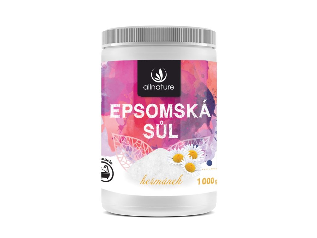 Epsomská minerální sůl do koupele s heřmánkem. Epsomská sůl detoxikuje, uvolňuje svaly a odbourává stres. Heřmánek vyniká svou schopností uvolňovat ucpané dýchací cesty během rýmy a zároveň jemně pečuje o pokožku.