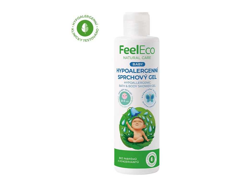 Feel Eco Baby koupelový a sprchový hypoalergenní gel je určen pro mytí jemné dětské pokožky a kratších vlásků pro děti od pozdnějšího kojeneckého věku, kdy je kožní ochranná funkce z velké části vyvinuta a děti ocení pěnivý zážitek z koupele bez pocitu vysušení po koupeli. Přírodní složení obsahuje pouze snadno rozložitelné PEG-free a sulfate-free mycí složky. Hypoalergenní test bezpečnosti HRIPT (Human Repeat Insult Patch Test) zaručuje vhodnost použití pro ekzematiky, alergiky a osoby s citlivou pokožkou.