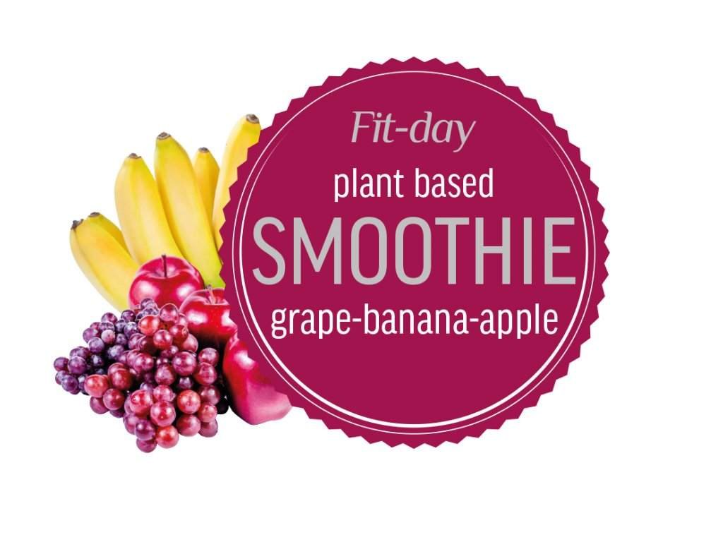 Osvěžující smoothie FIT-DAY Plant based smoothie HROZNO-BANÁN-JABLKO má lahodnou chuť hroznovéo vína, banánu a jablka (podíl ovocné složky 50 %). Je ideální na přípravu snídaňových nápojů, neboť dodává dlouhodobý pocit sytosti a je lehce vstřebatelný.