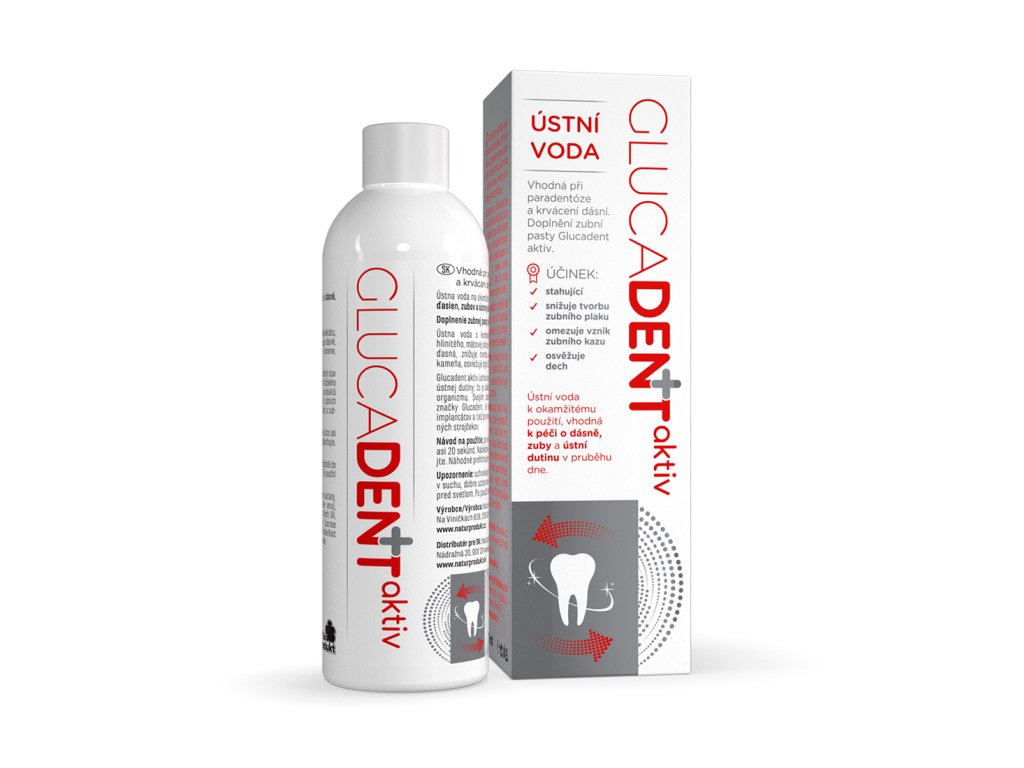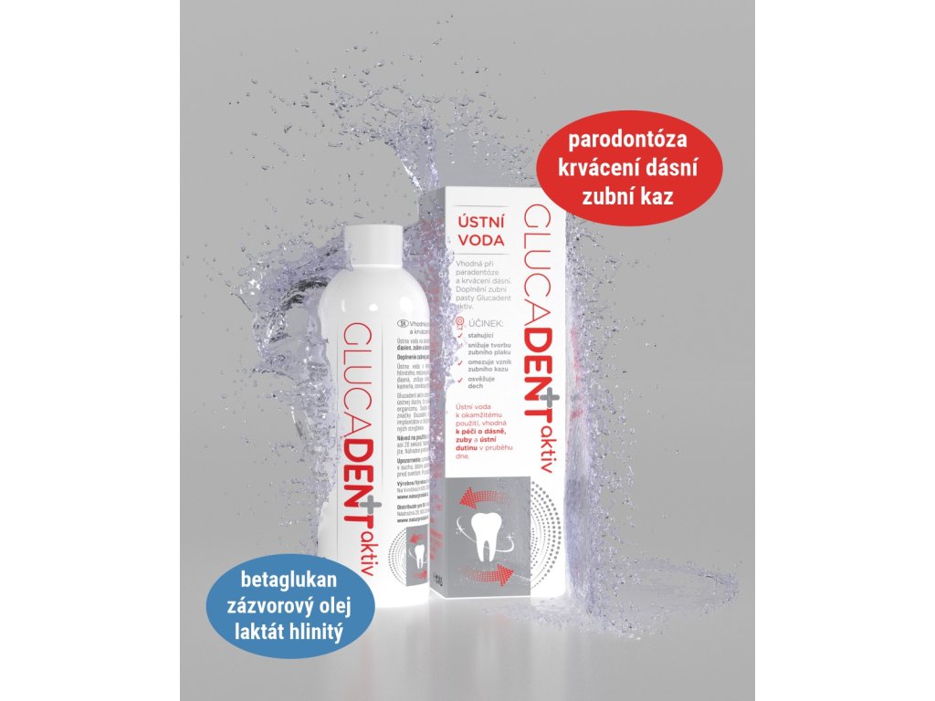 Ústní voda Glucadent+ udržuje zdraví a dobrý stav dutiny ústní. Kombinace beta-glukanu, zinečnatých solí a zázvorového oleje snižuje tvorbu zubního plaku a zubního kamene, osvěžuje dech, omezuje vznik zubního kazu a snižuje krvácivost dásní. Ústní voda je určena k okamžitému použití. Je vhodná po zavedení zubních implantátů a také pro nositele zubních náhrad a zubních rovnátek. Je vhodná k dlouhodobému používání. Neobsahuje fluoridy a alkohol.