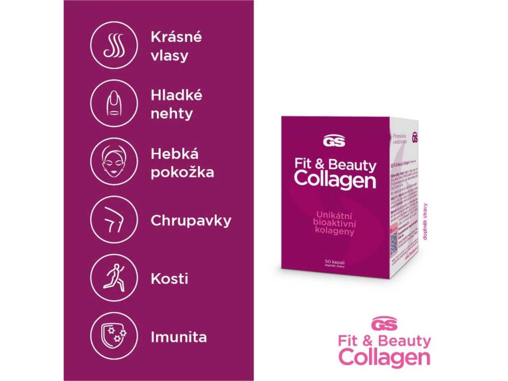 GS Fit&Beauty Collagen obsahuje kombinaci kolagenu typu I a II, které jsou přirozenou součástí lidského těla. Kolagen je základní strukturální bílkovina pokožky, vlasů, nehtů, kostí a chrupavek. S přibývajícím věkem jeho přirozená tvorba klesá, což se může projevit ztrátou pružnosti pokožky a oslabením vlasů či nehtů.