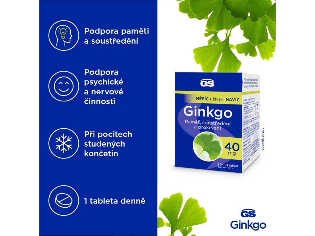 GS Ginkgo 40 mg kombinuje účinky dvou tradičně užívaných rostlin – Ginkgo biloba a gotu kola. Standardizovaný extrakt z mladých listů jinanu dvoulaločného je získáván speciální technologií, která zaručuje přesně definovaný obsah aktivních látek (24 % flavonoidů a 6 % terpenolaktonů). Tyto složky jsou spojovány s podporou normální mikrocirkulace krevního oběhu, zejména v oblasti mozku.