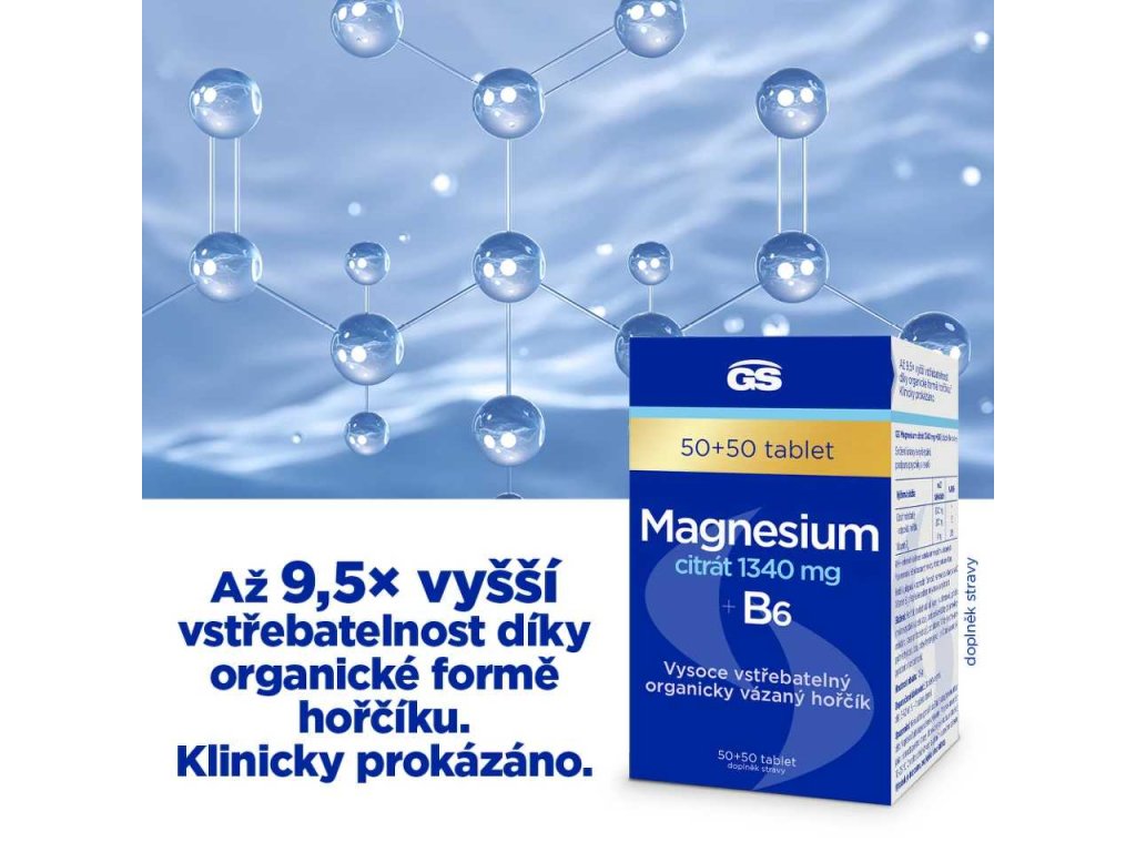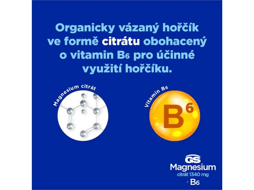 GS Magnesium citrát 1340 mg + B6 obsahuje organicky vázaný hořčík ve formě citrátu, který se vyznačuje velmi dobrou biologickou dostupností. Ve srovnání s běžně používanými formami, jako je oxid, chlorid nebo uhličitan hořečnatý, se citrát lépe vstřebává a je šetrnější k trávicímu traktu.
