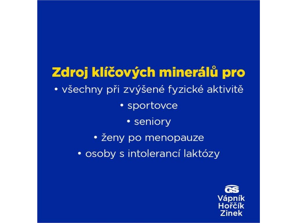 GS Vápník, hořčík, zinek představuje vyváženou kombinaci klíčových minerálních látek a vitaminů, které se podílejí na celé řadě fyziologických procesů v organismu. Vápník je základní stavební složkou kostí a zubů a je důležitý pro normální činnost svalů i přenos nervových vzruchů. Jeho účinek je podpořen přítomností vitaminu D3, který napomáhá jeho vstřebávání ze střeva a přispívá k optimálnímu ukládání v kostní tkáni.