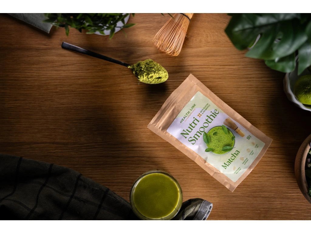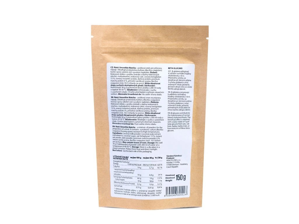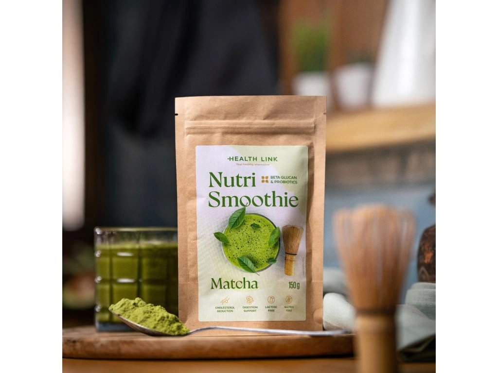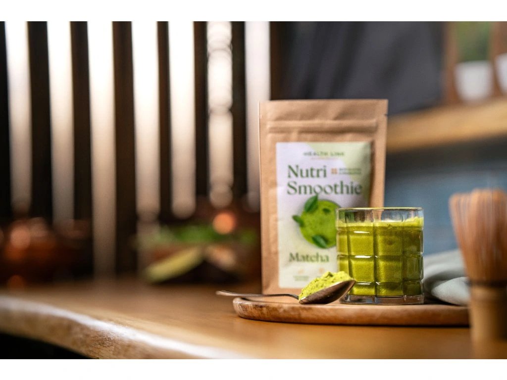 Nutri smoothie Matcha, prášková směs pro přípravu nápoje. Obsahuje probiotickou strukturu tvořící spóry odolné vůči vysokým teplotám.